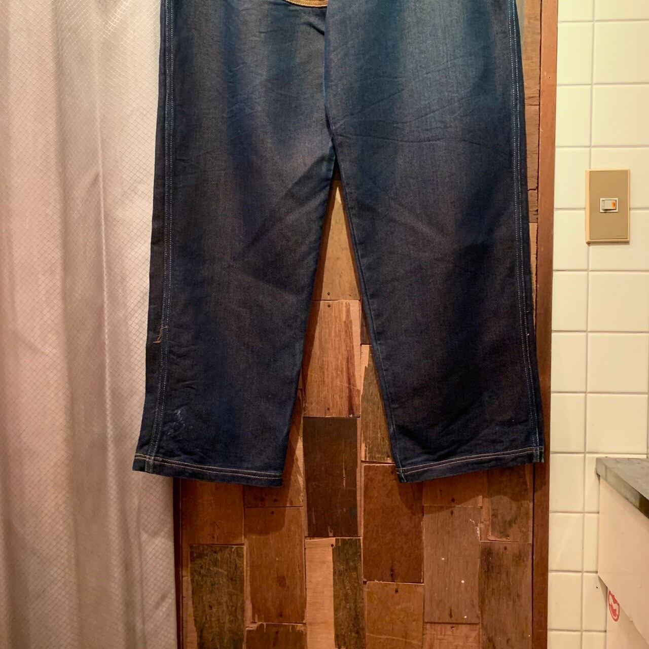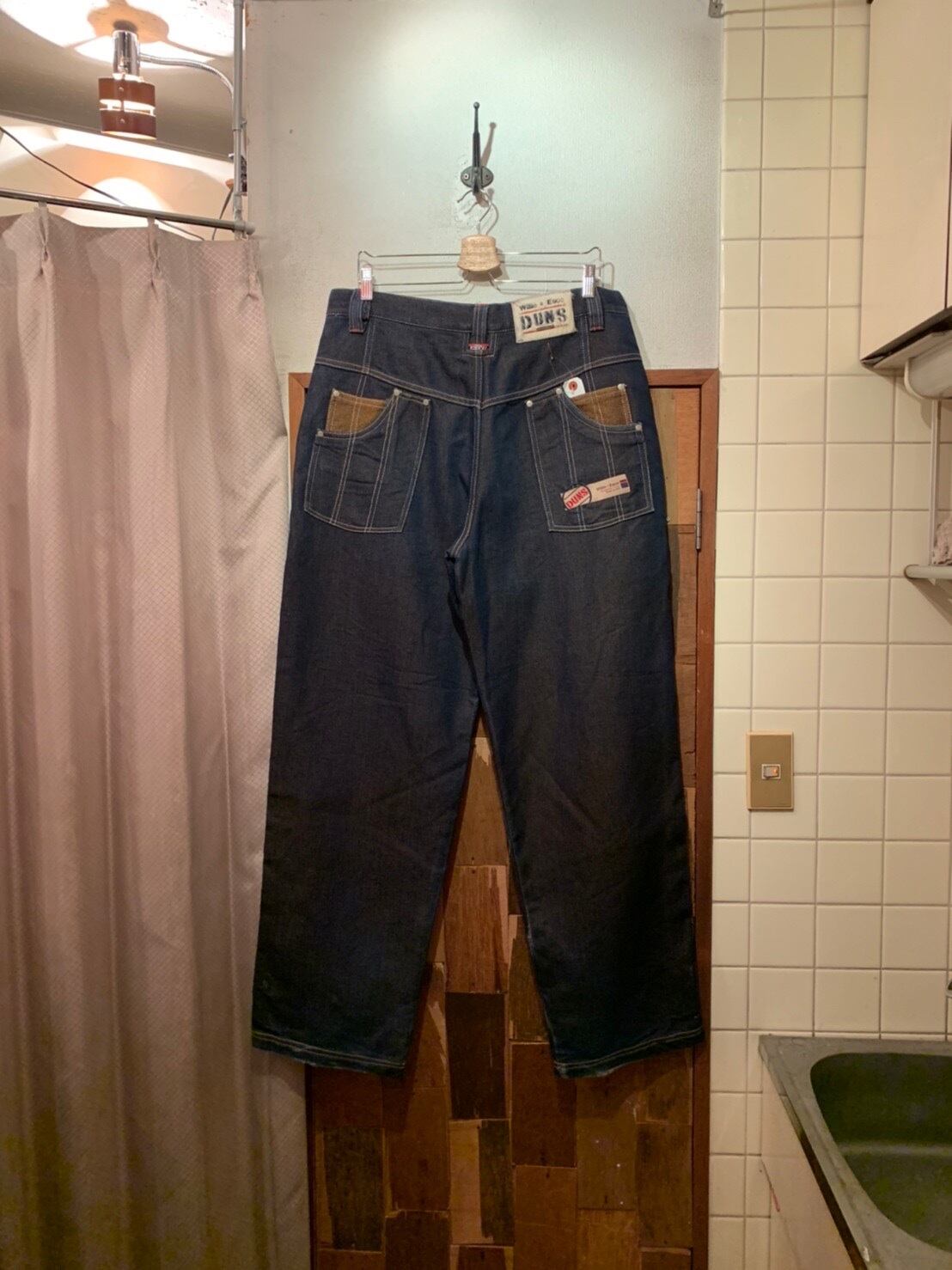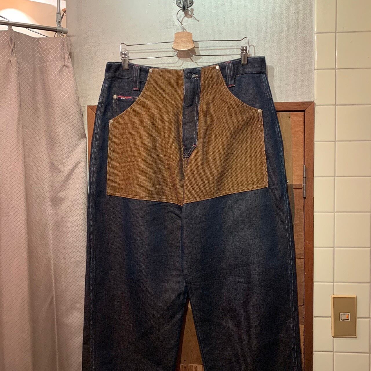 “DUNS” indigo×yellow brown cotton/poly switch design wide denim pants