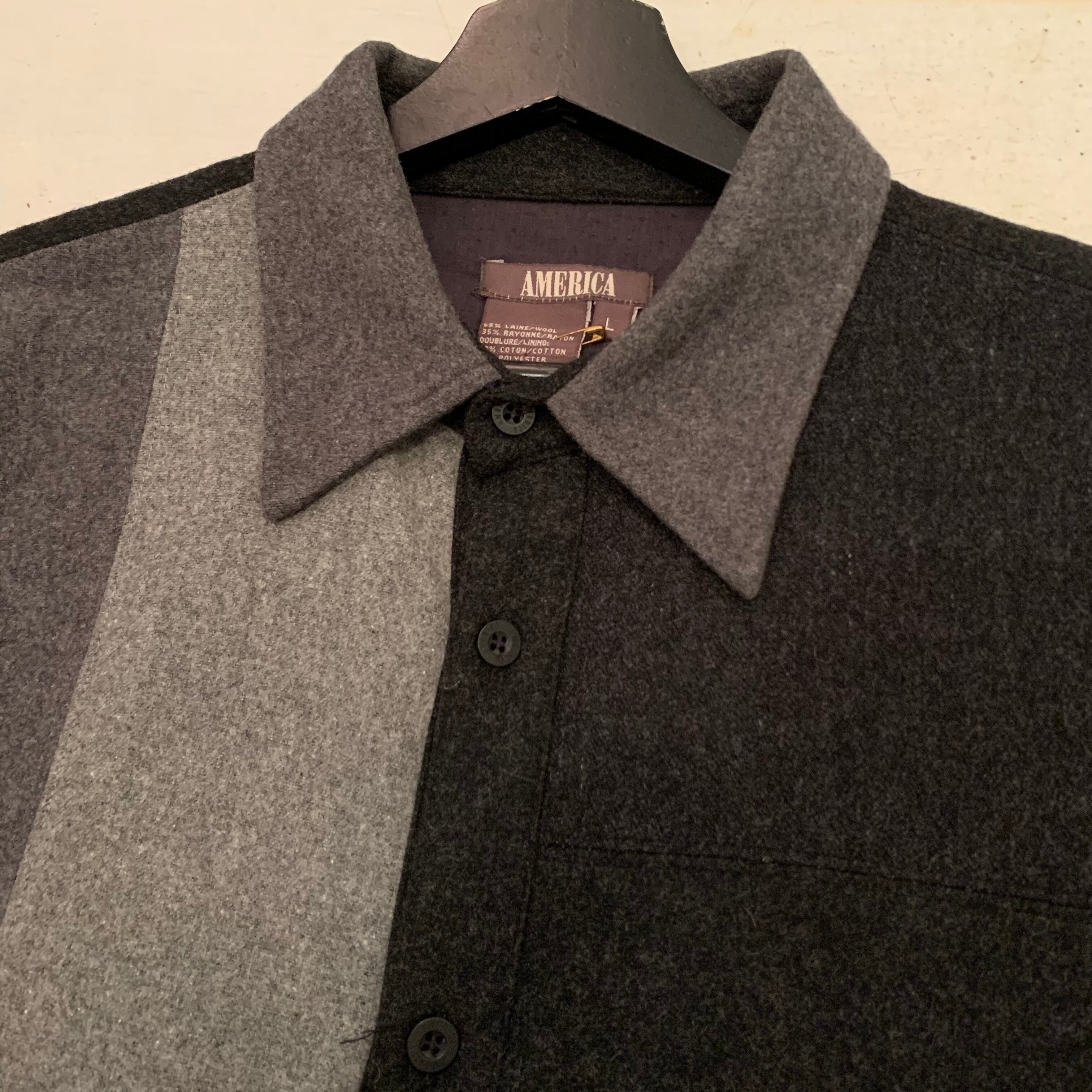 “AMERICA” charcoal gray×black×gray wool/rayon design shirt jacket