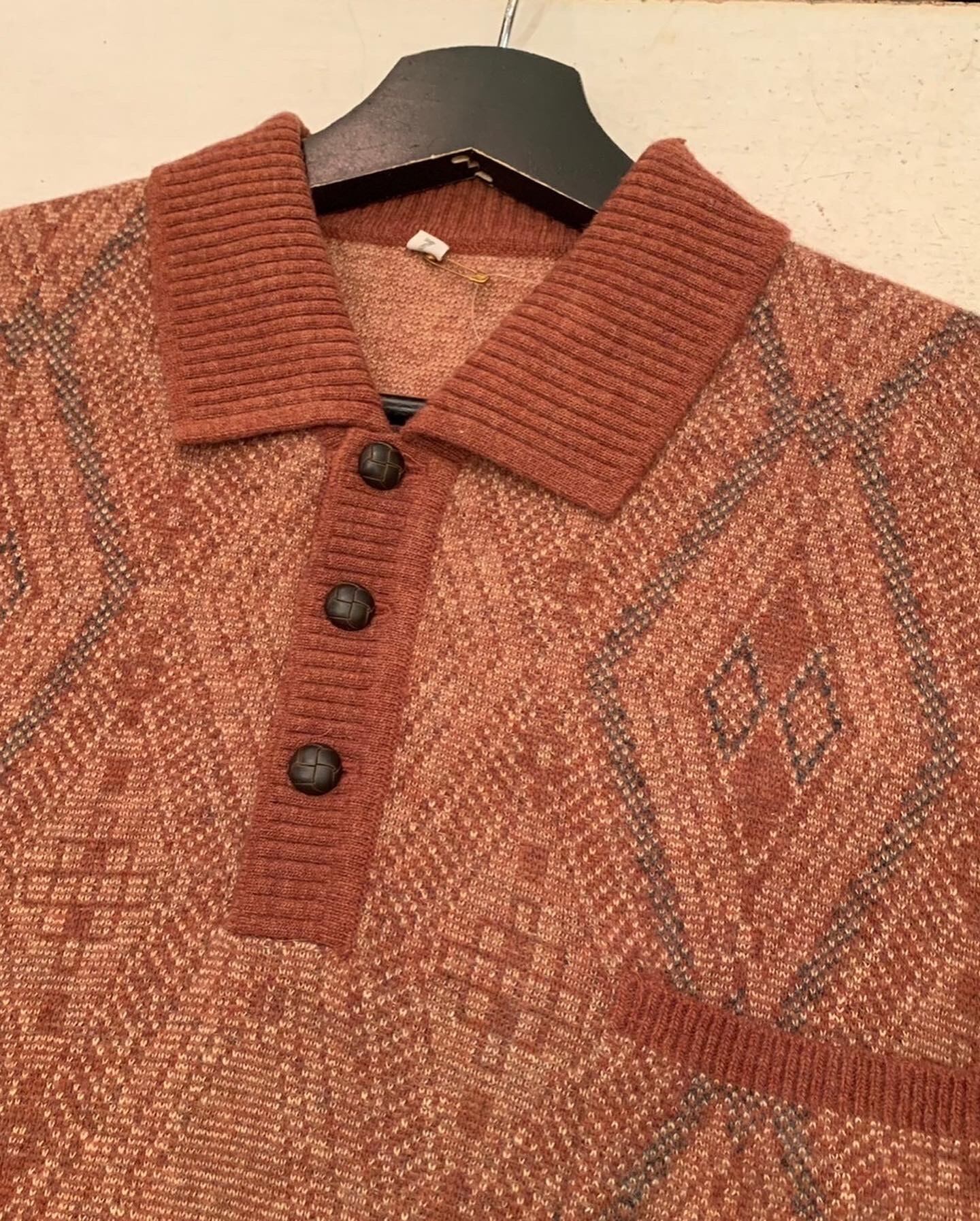 “brand unknown” brown base wool/nylon repeating L/S knit polo shirt