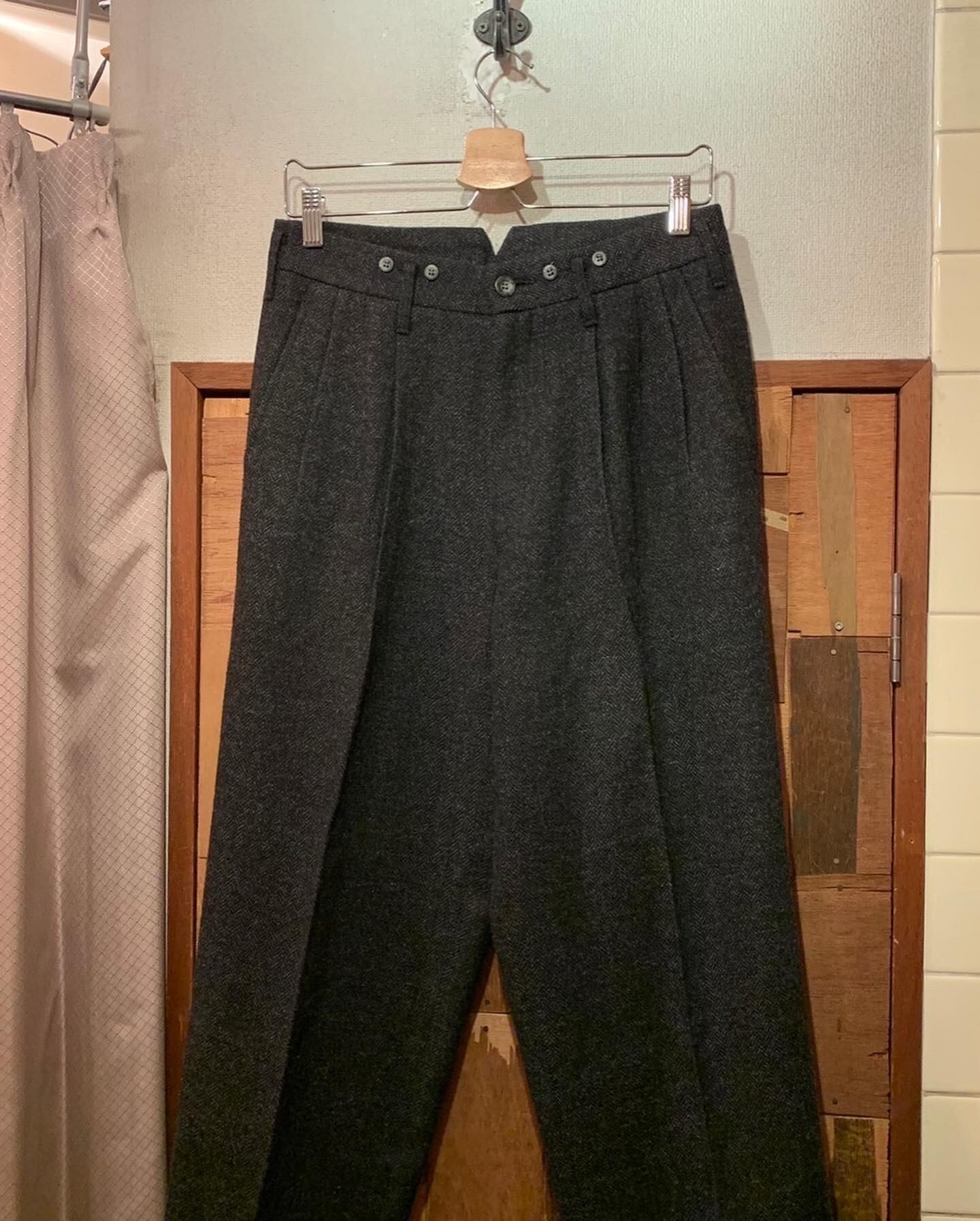 “brand unknown” black wool/acrylic/poly/nylon herring bone 3tuck slacks