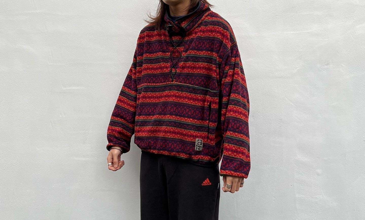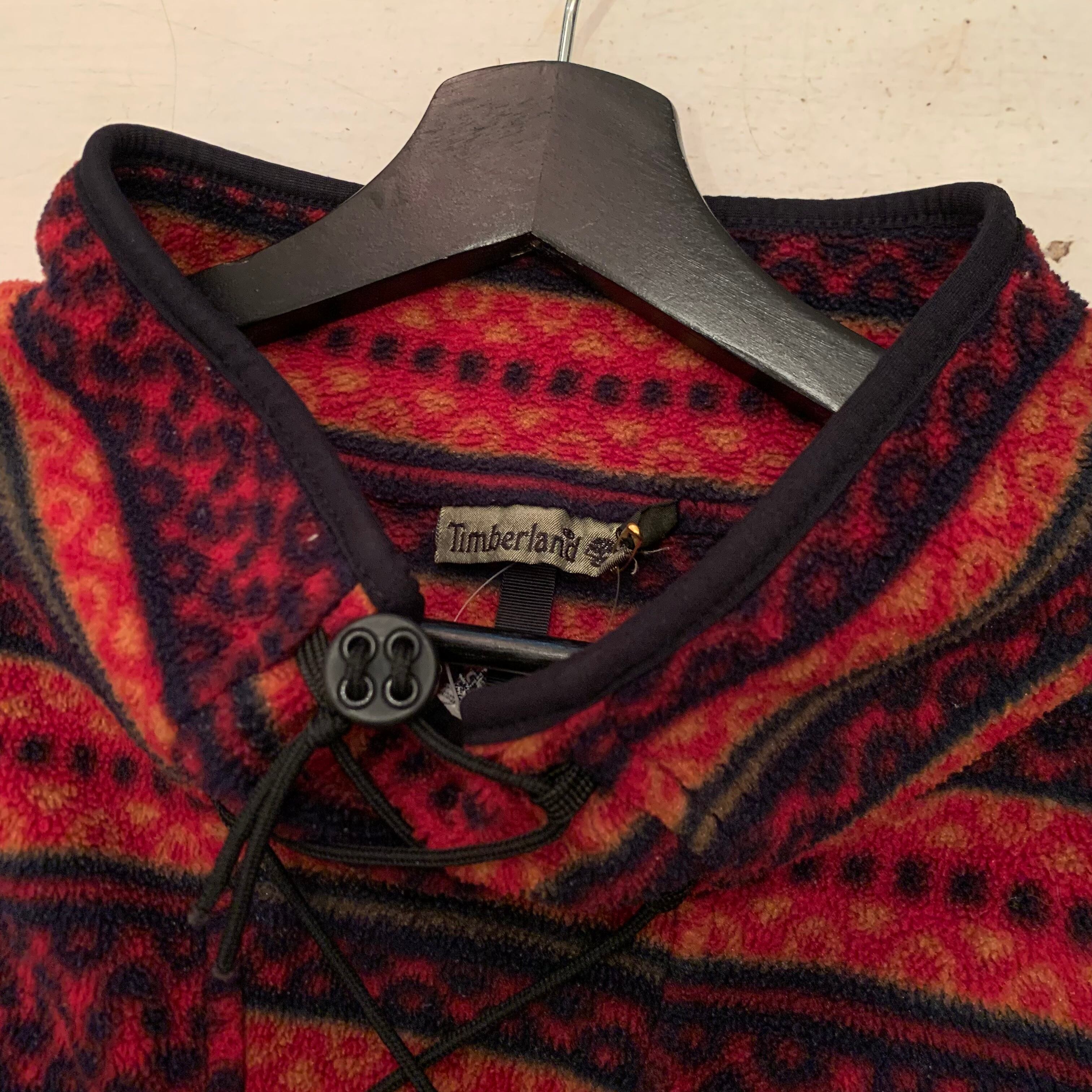 “Timberland” 1995!! red base poly/nylon ethnic pattern code-up fleece pullover made in USA