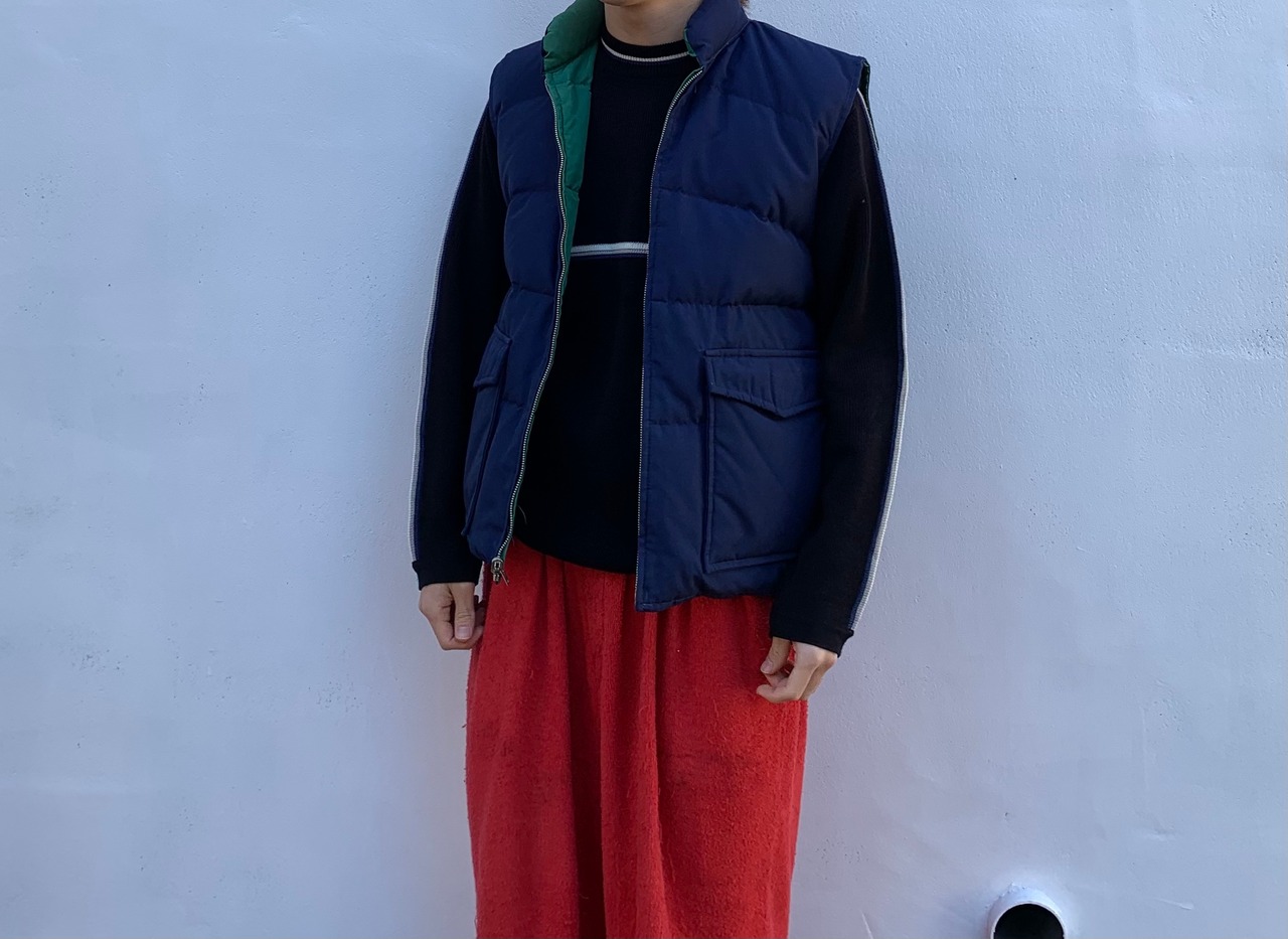 “BIBI BROS” green×navy poly/cotton reversible down vest