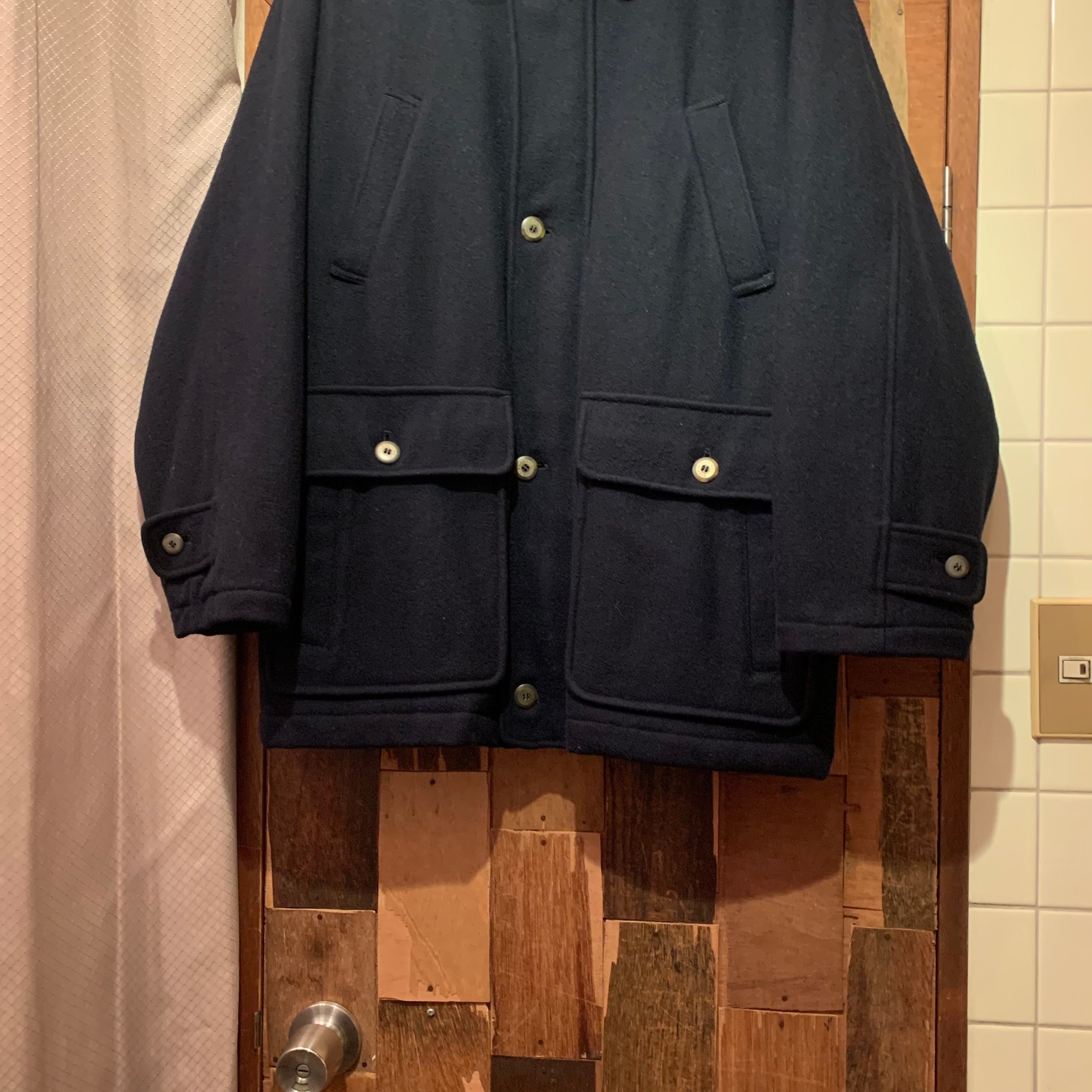 “CUBIC MEASURE” navy×brown wool/rayon switch collar half-coat