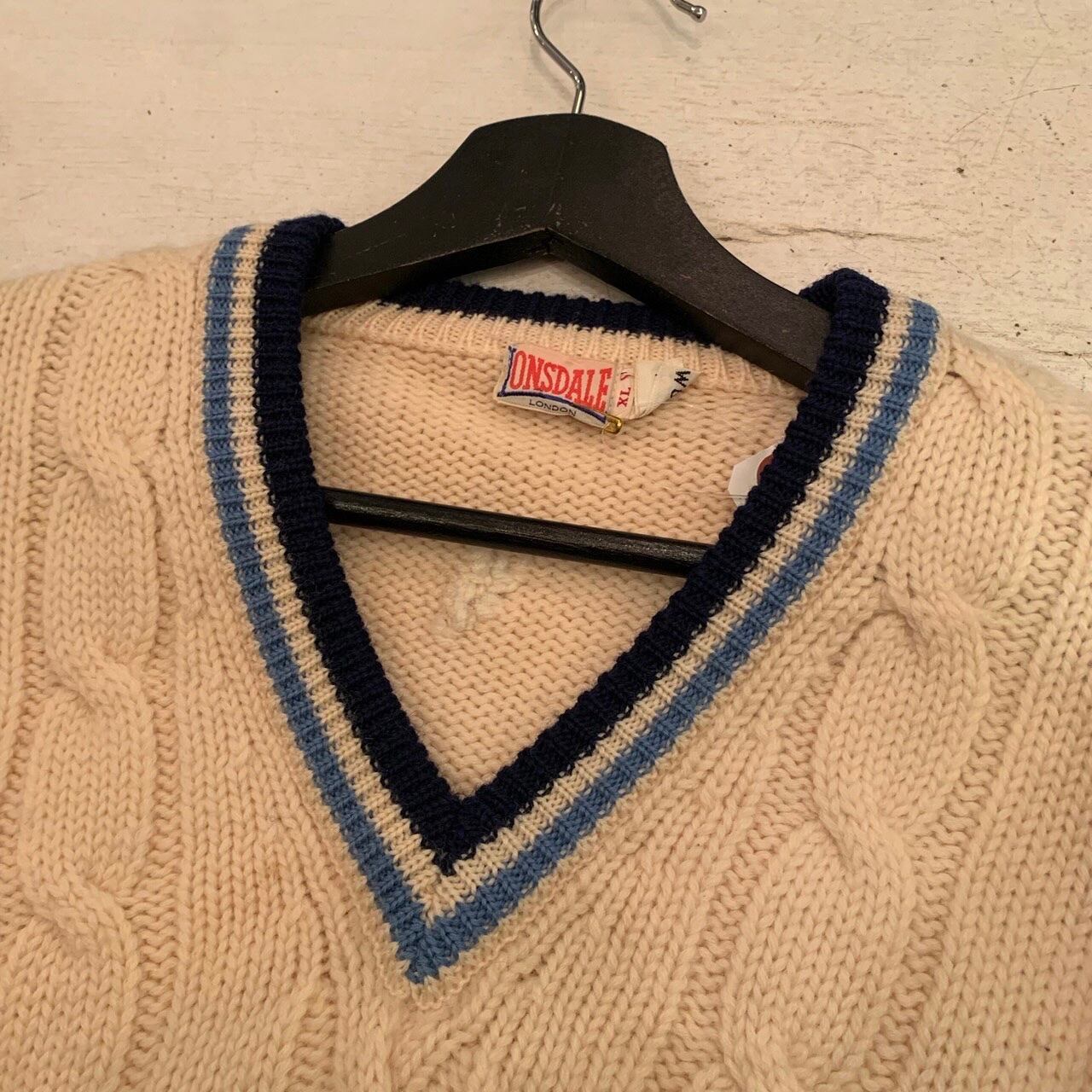 “LONS DALE” 70's~80's ivory×blue×light blue wool v-neck cable knit sweater