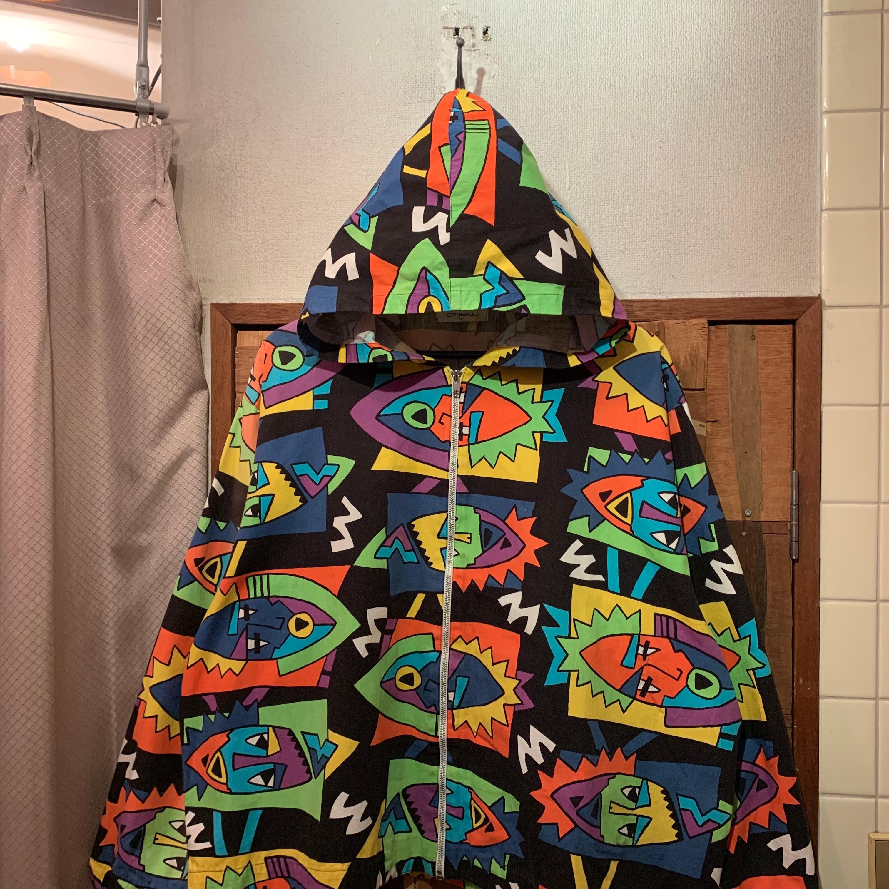 “O’NEILL” 90’s multi color unique pattern short length zip-up hoodie