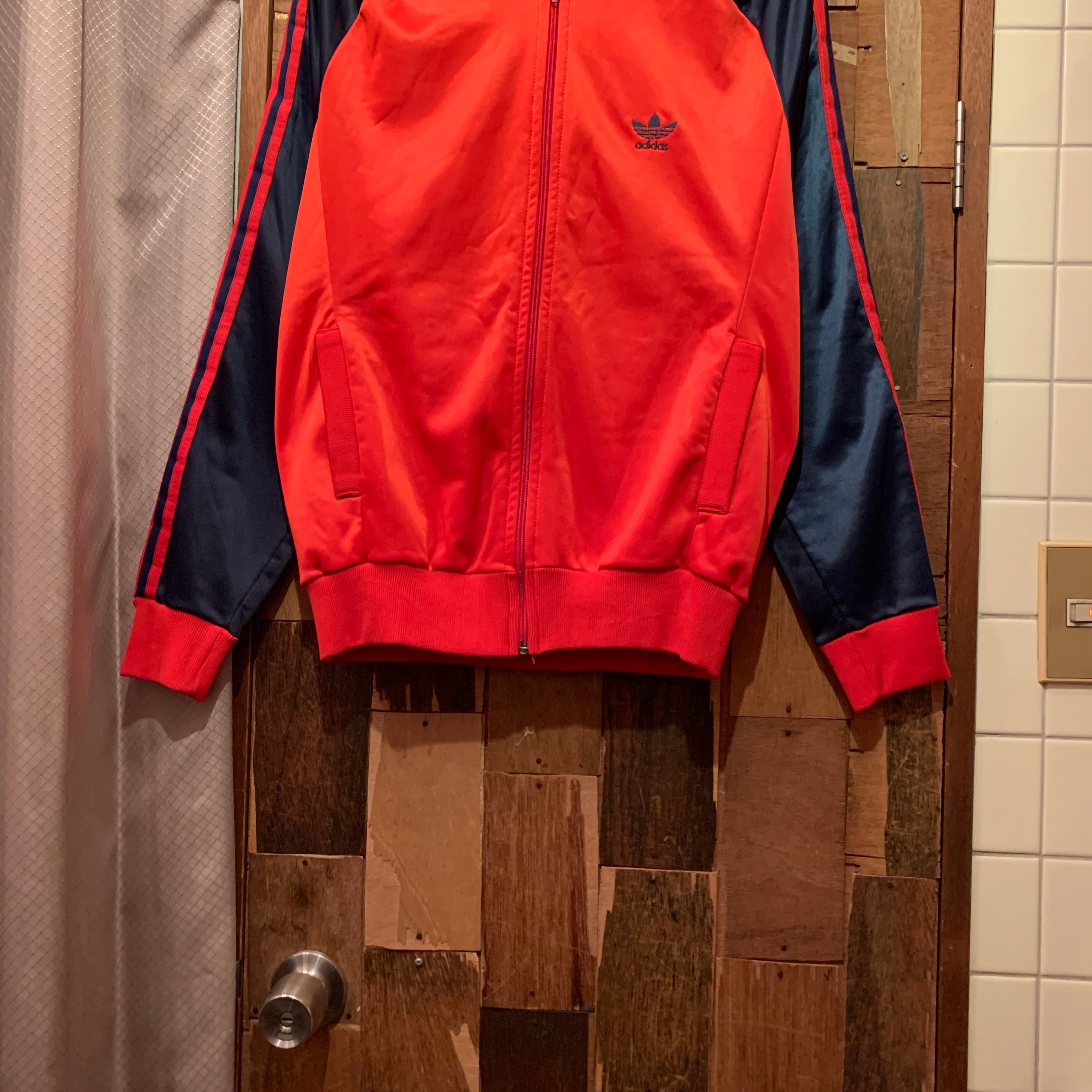 “adidas” 80’s ATP red×navy poly/triacetate track jacket made in USA