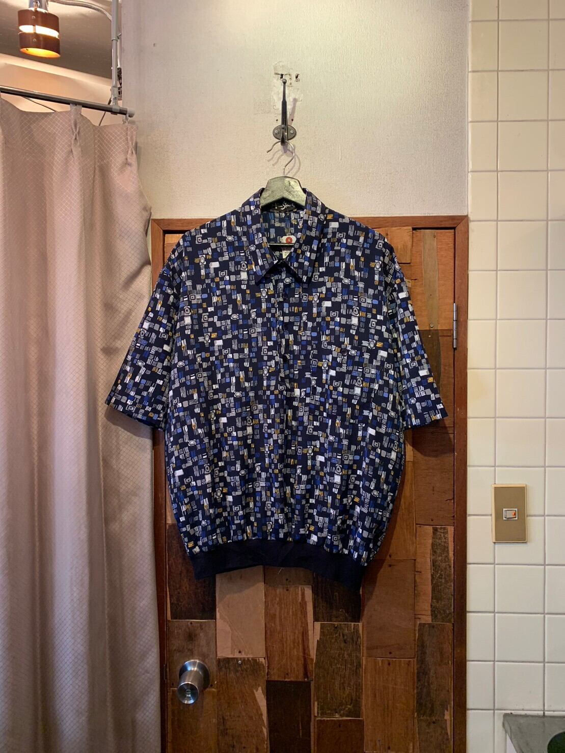 “Aean Stucnt” navy×gray×white polyester repeating pattern S/S polo shirt made in U.S.A