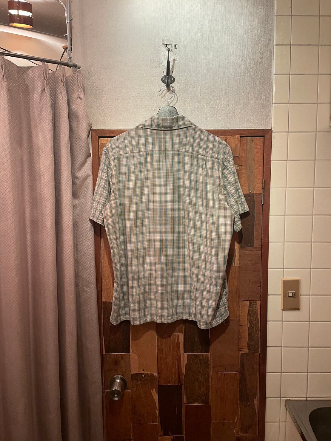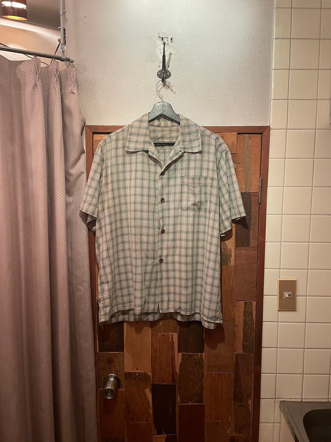 “brand unknown” ~60’s vintage beige base check pattern S/S open-collar shirt