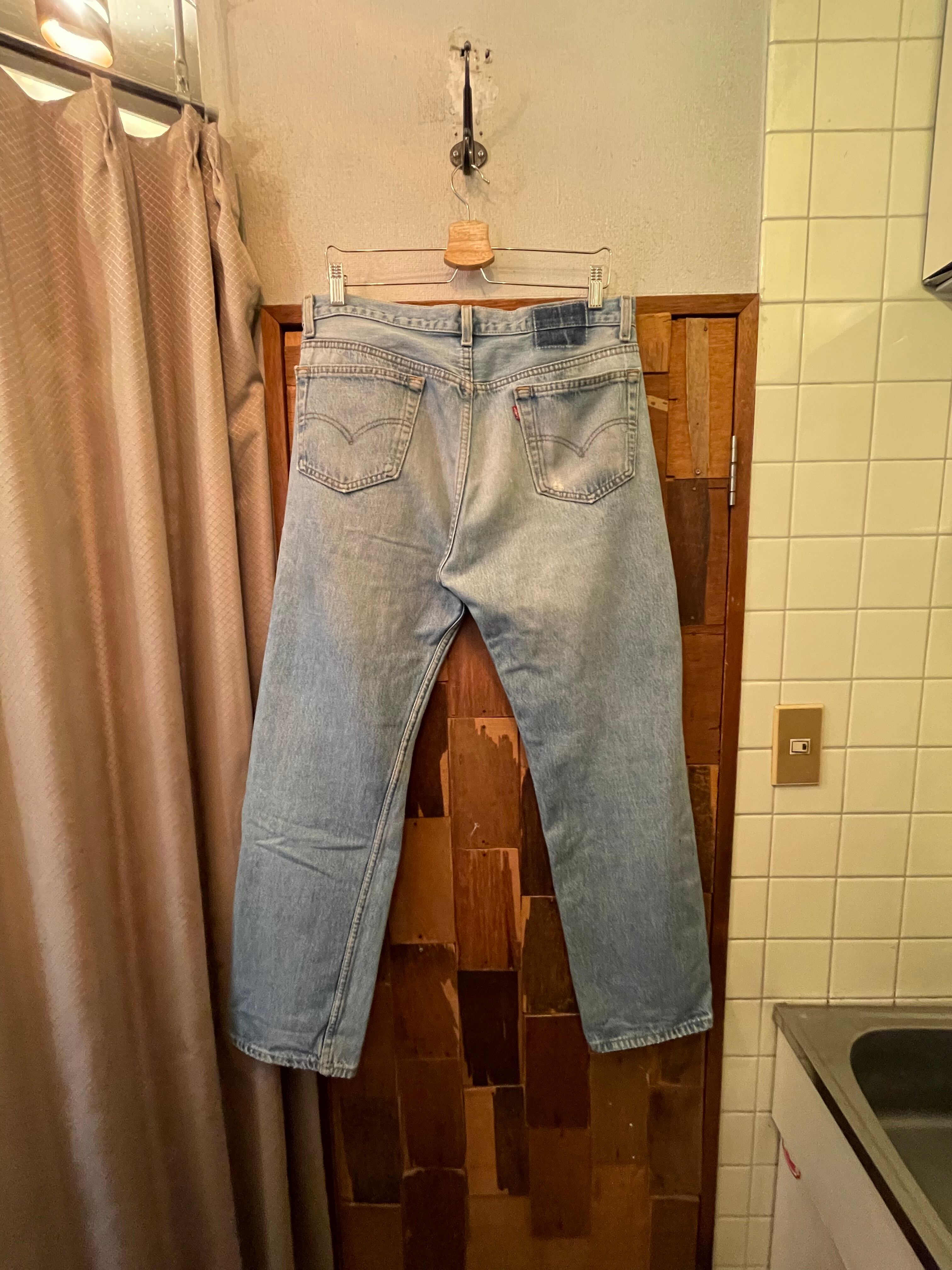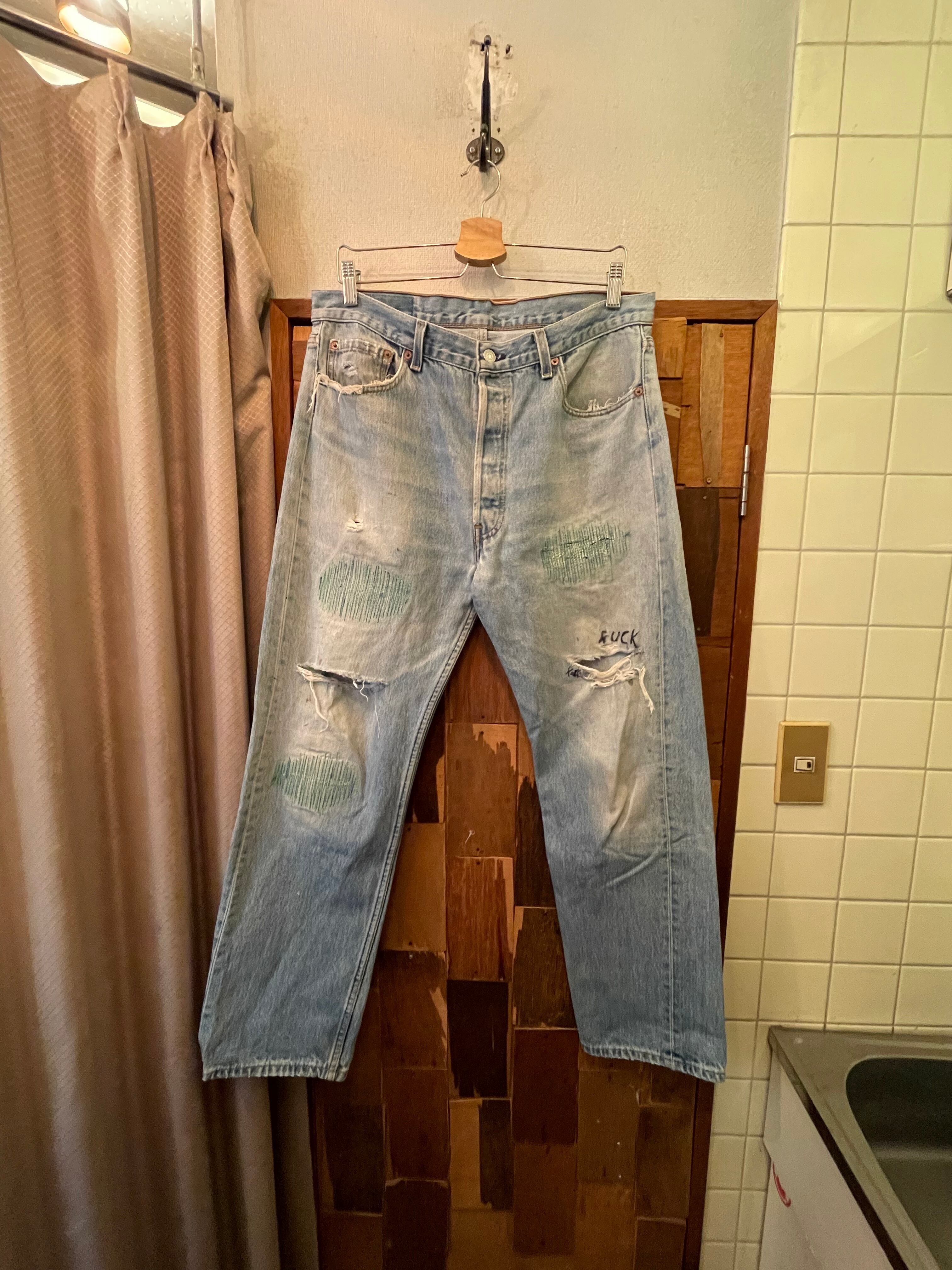 “Levi’s” 90’s indigo cotton damage&repair design denim pants made in U.S.A