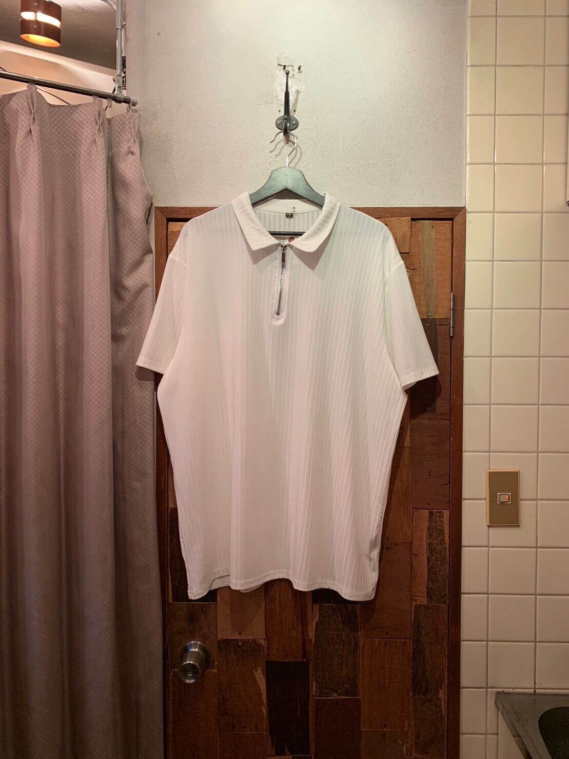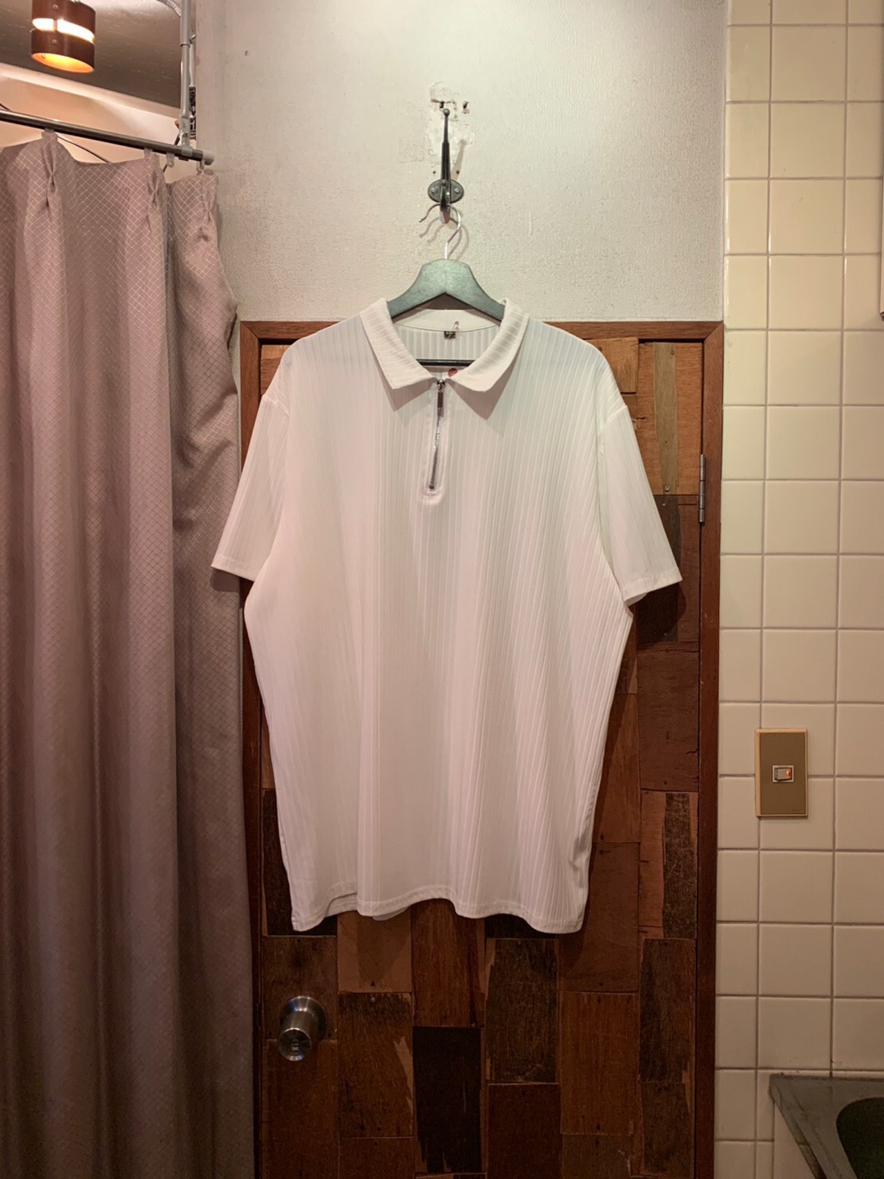 “brand unknown” white poly/cotton S/S half-zip shirt