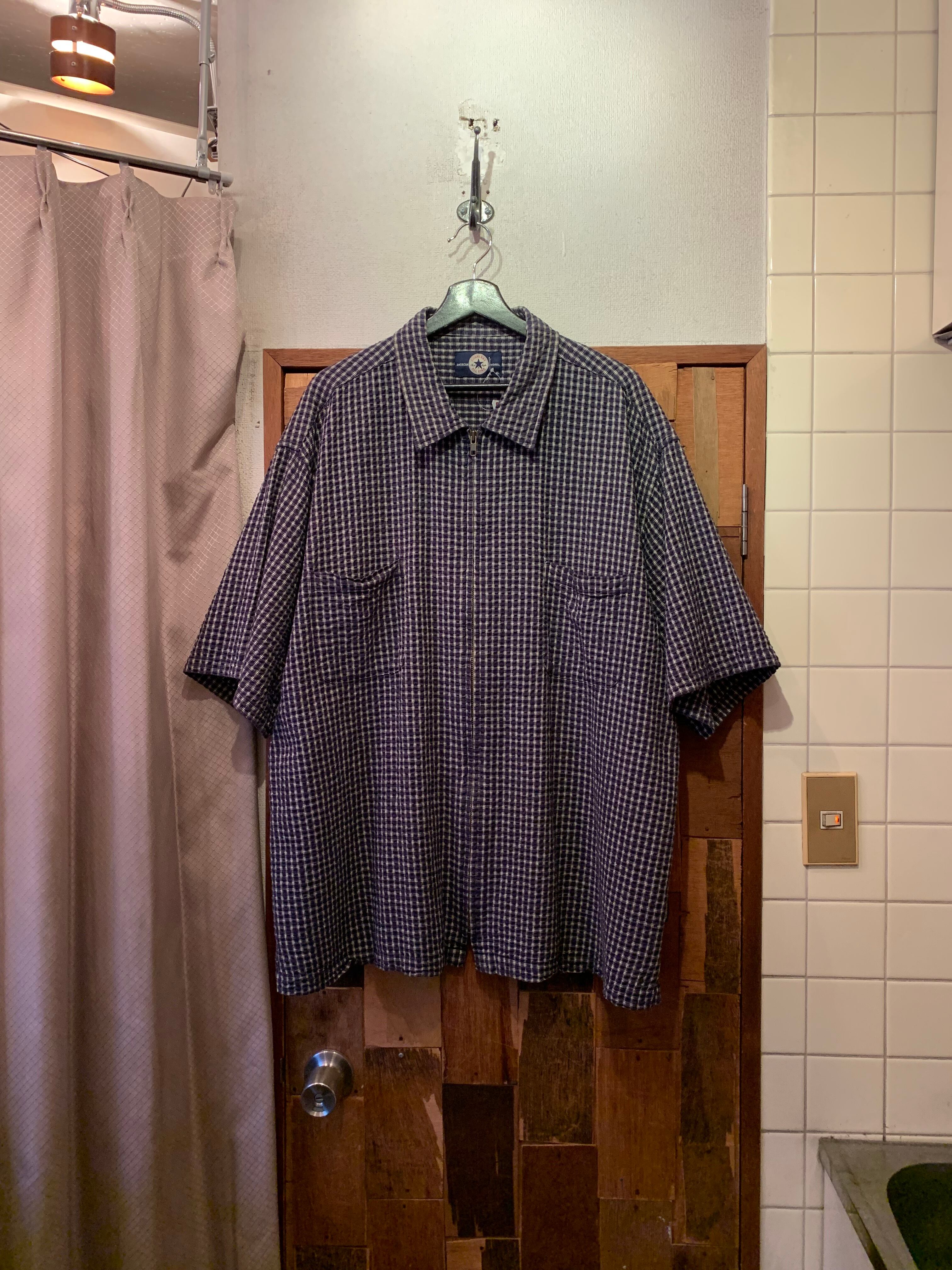“converse” navy cotton check pattern zip-up S/S seersucker shirt