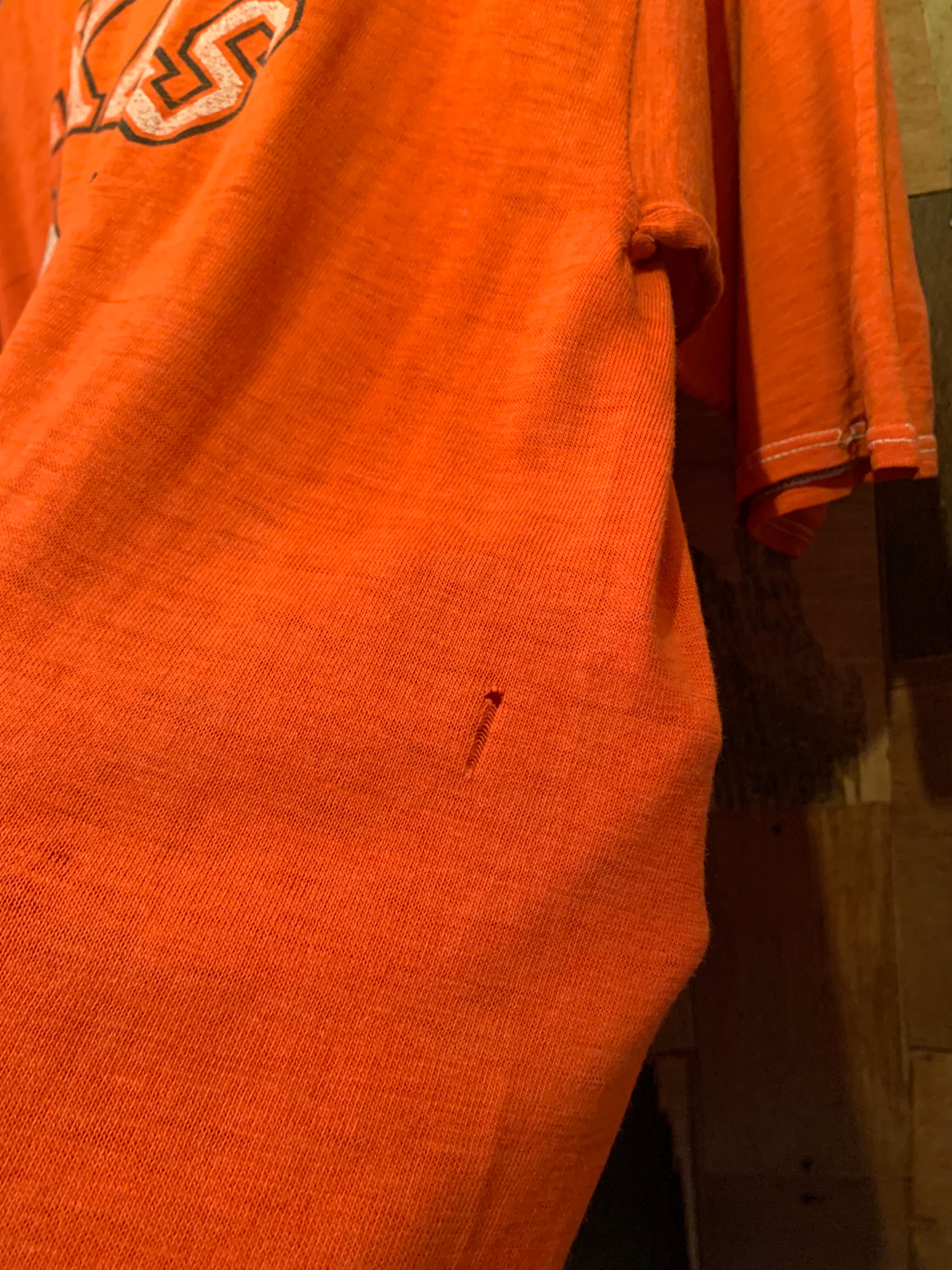 “M.J.SOFFE” 80’s orange cotton/poly printed football Tee made in USA