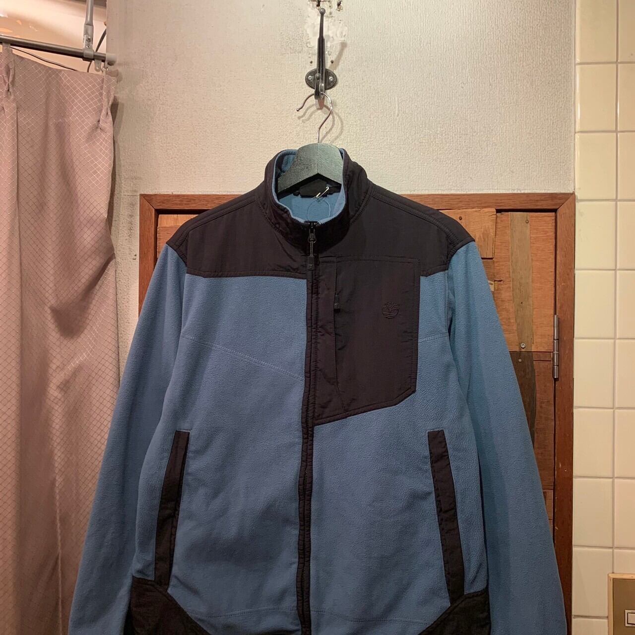 “Timberland” light blue×black switch design zip-up fleece jacket