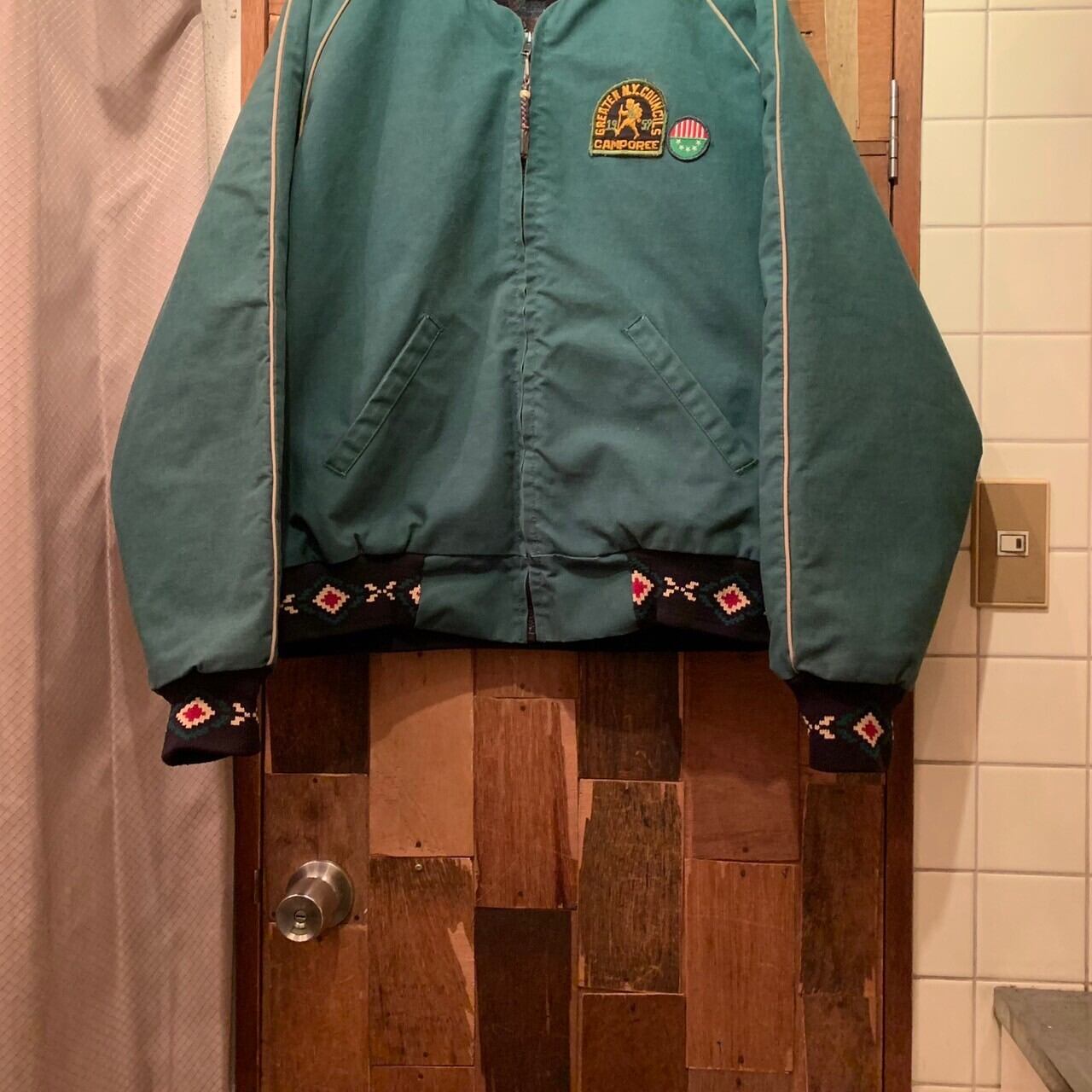 “Tote Along” green poly/cotton wappen design zip-up blouson made in U.S.A