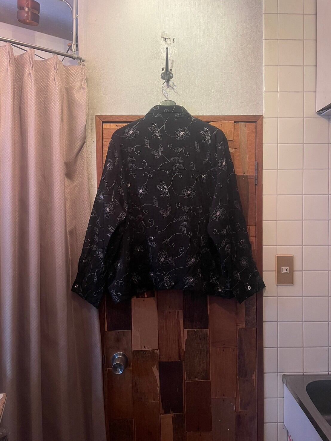 “CAROLE LITTLE” black silk/nylon embroidery design trucker shirt jacket