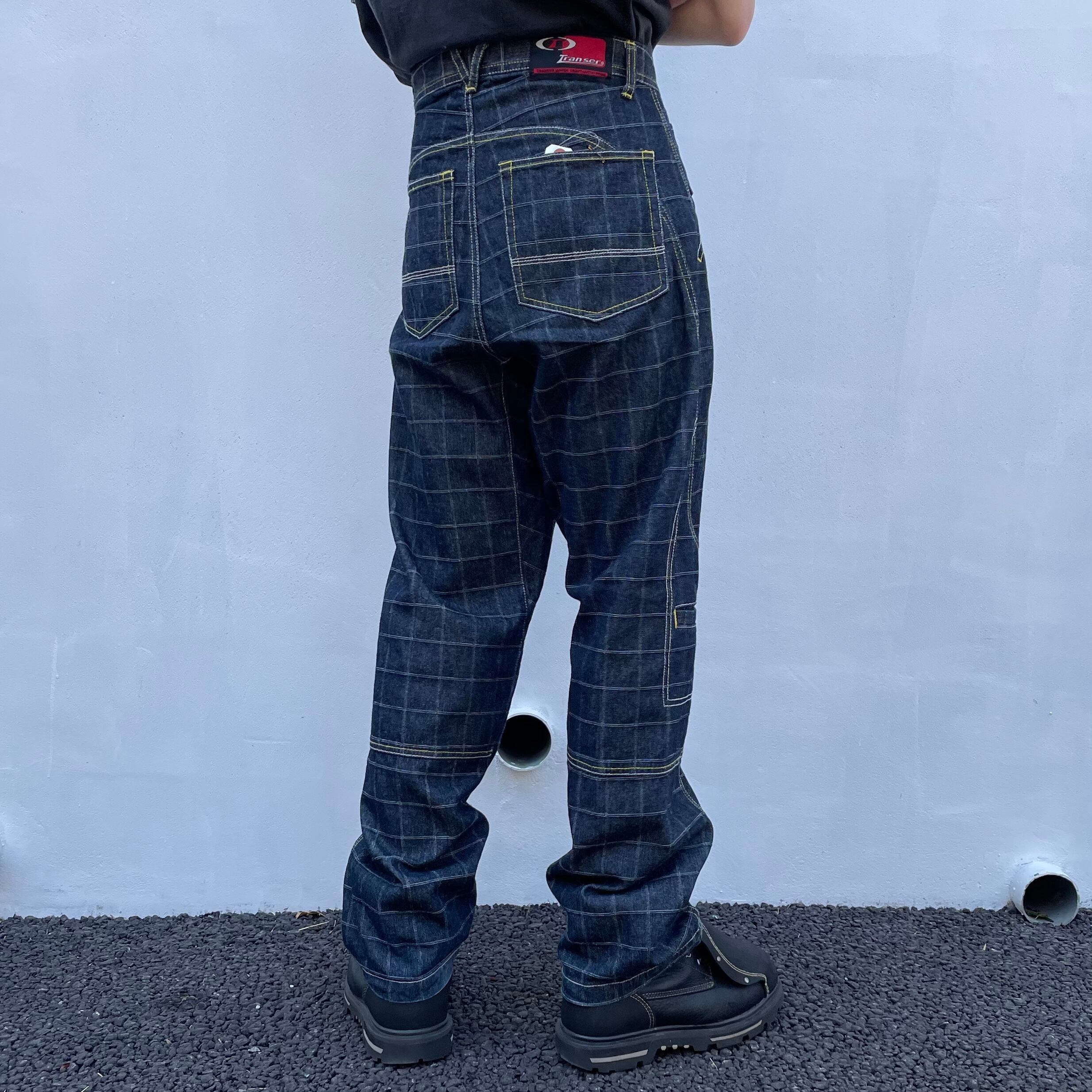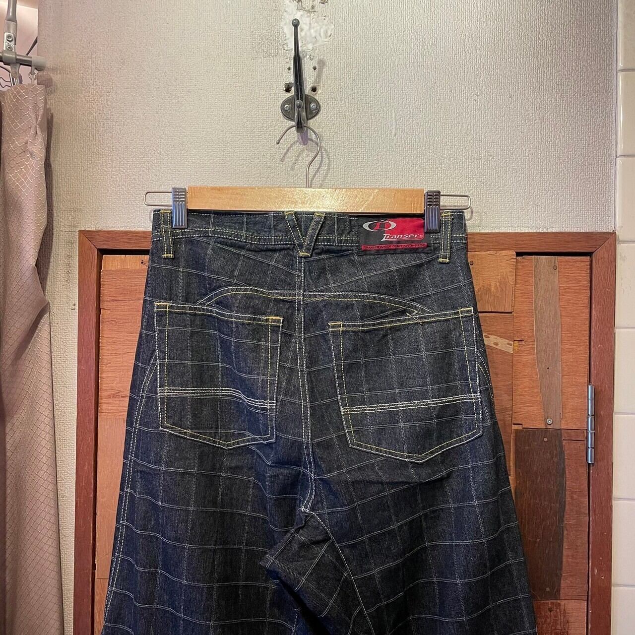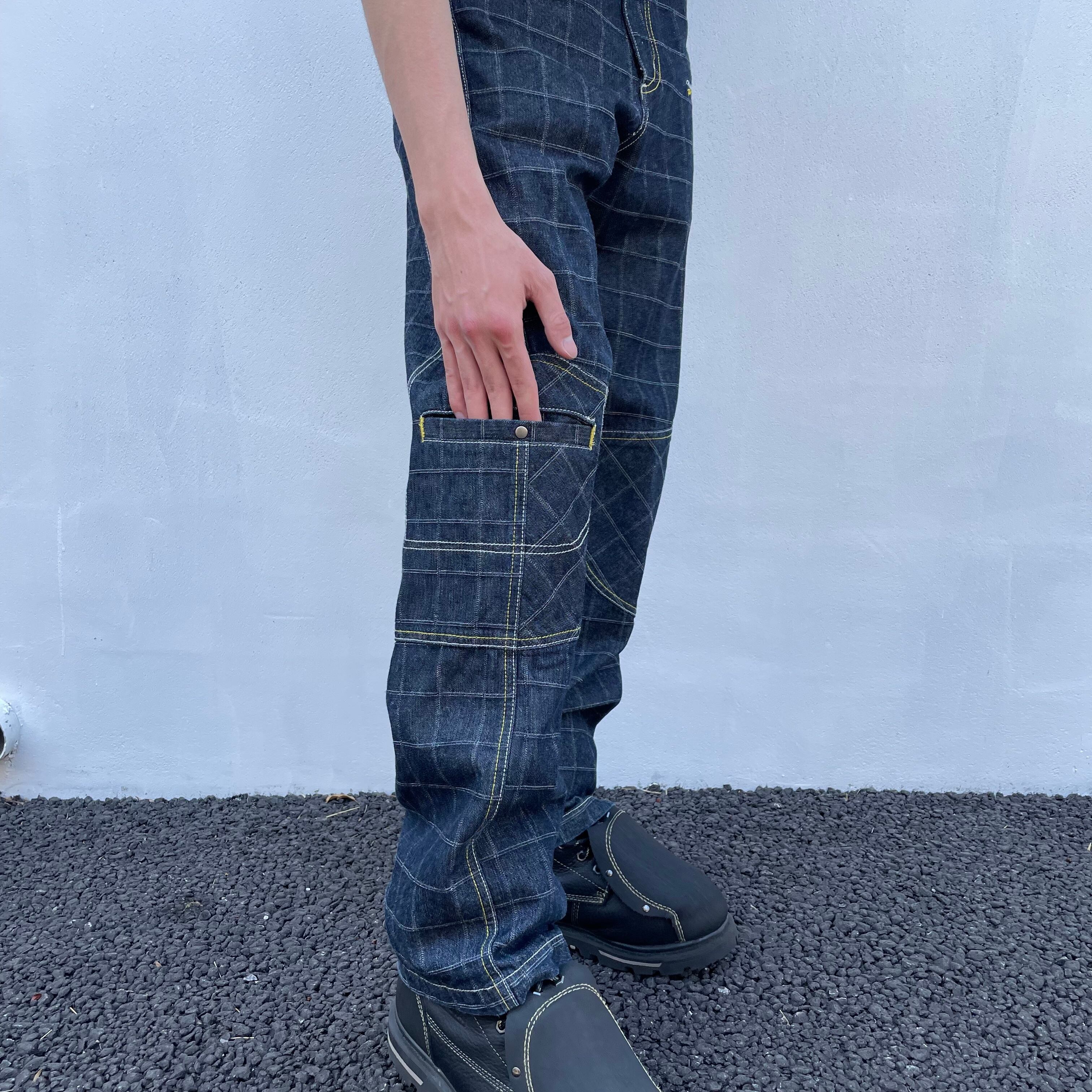 “TRANSER” 00's indigo×yellow cotton check pattern denim pants