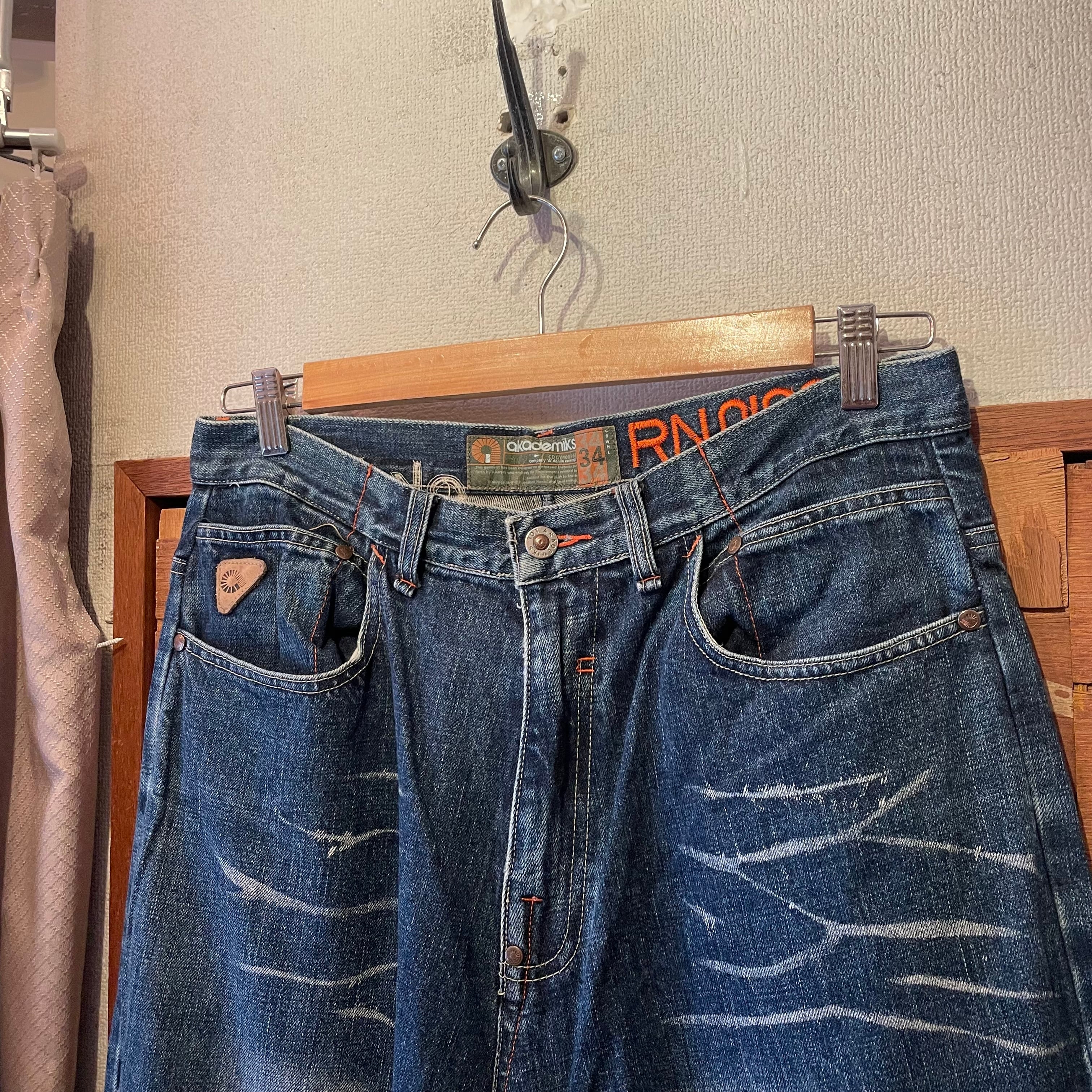 “akdmks” 90’s indigo cotton embroidery damage design denim pants