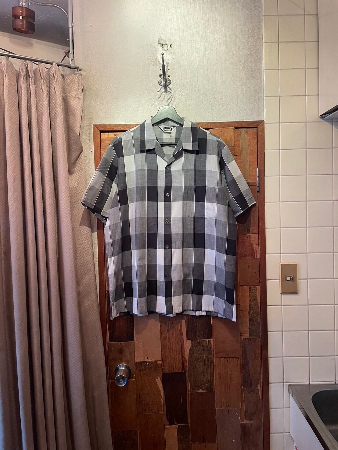 “Triumph” 60’s black×white×gray poly/cotton check pattern S/S open-collar shirt