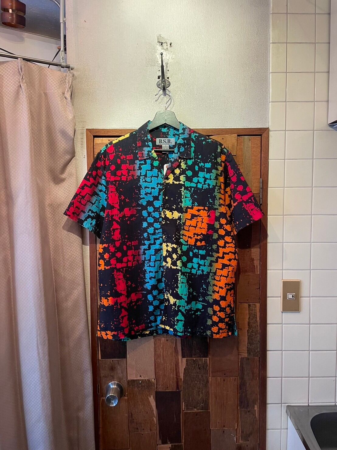 “B.S.R” 90's black×multicolor cotton design S/S open collar shirt