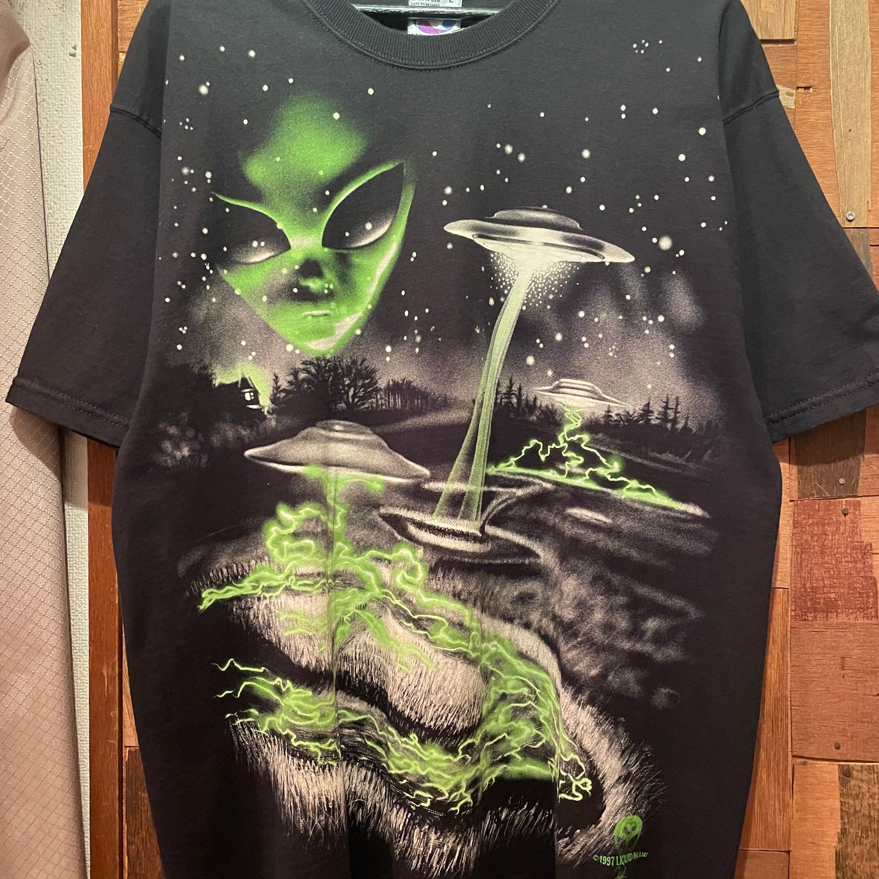 “LIQUID BLUE” 90’s black×light green cotton printed S/S Tee made in U.S.A