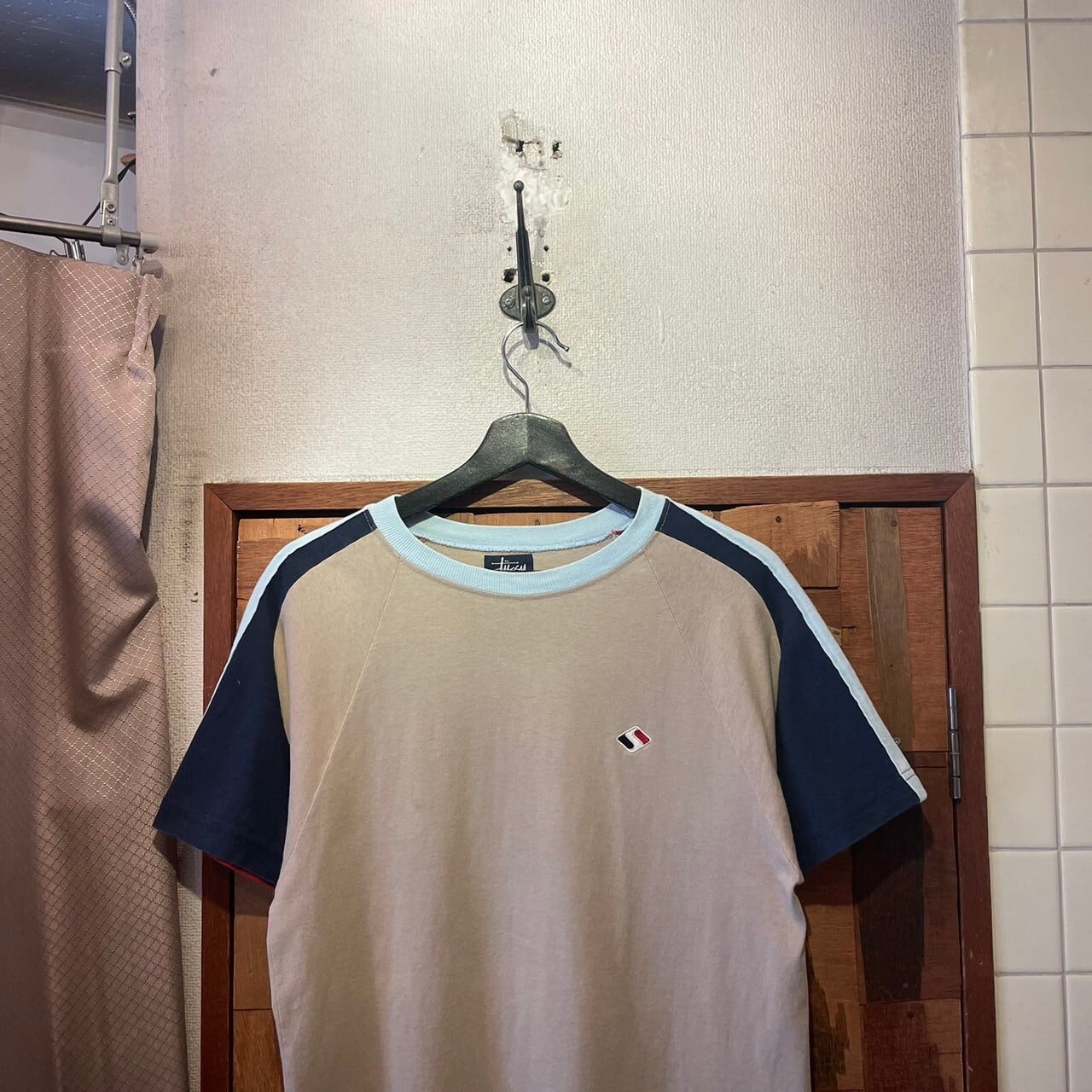 “STUSSY” 90's beige×navy×red cotton design S/S Tee made in USA