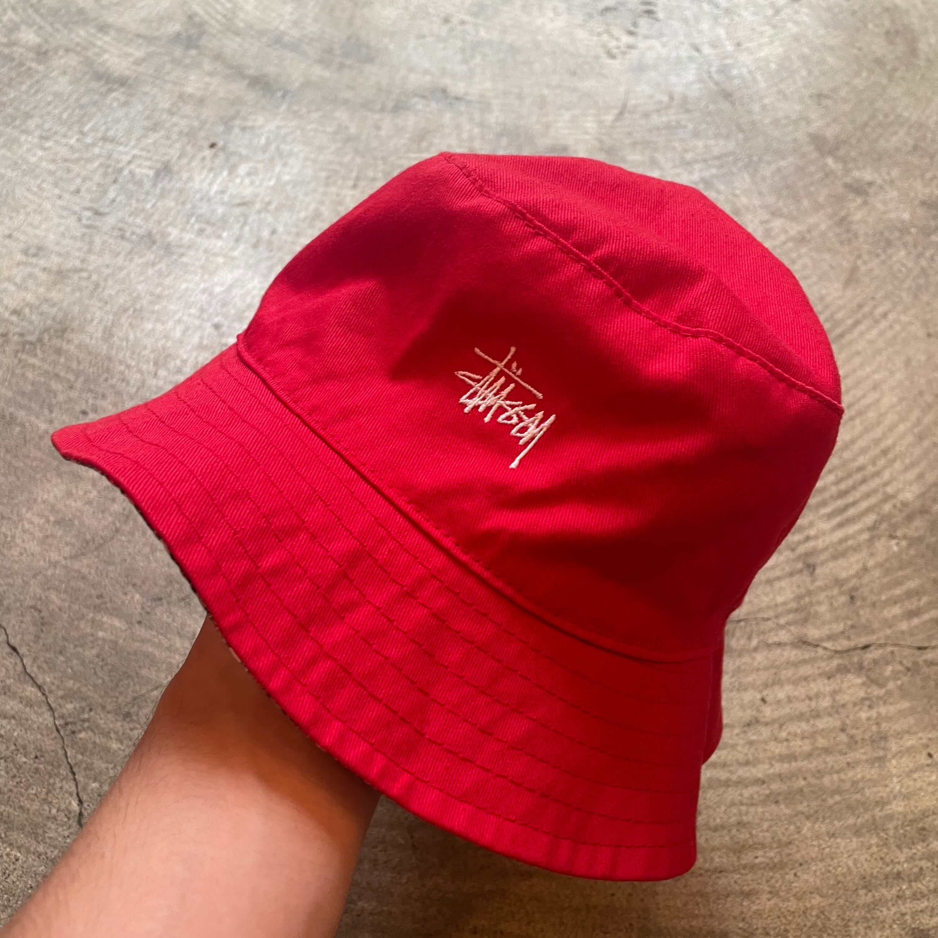 “stussy” red×white×black cotton check pattern reversible bucket hat made in U.S.A