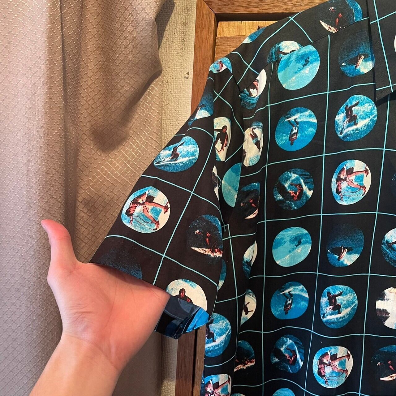 “ARROW” 90's black×blue cotton/poly design S/S shirt