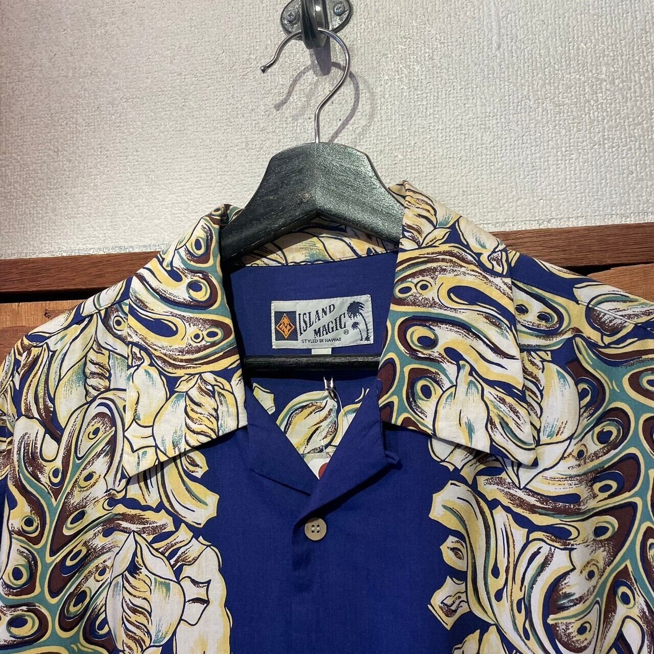 “ISLAND MAGIC” 90's navy×multicolor rayon design S/S Hawaiian shirt
