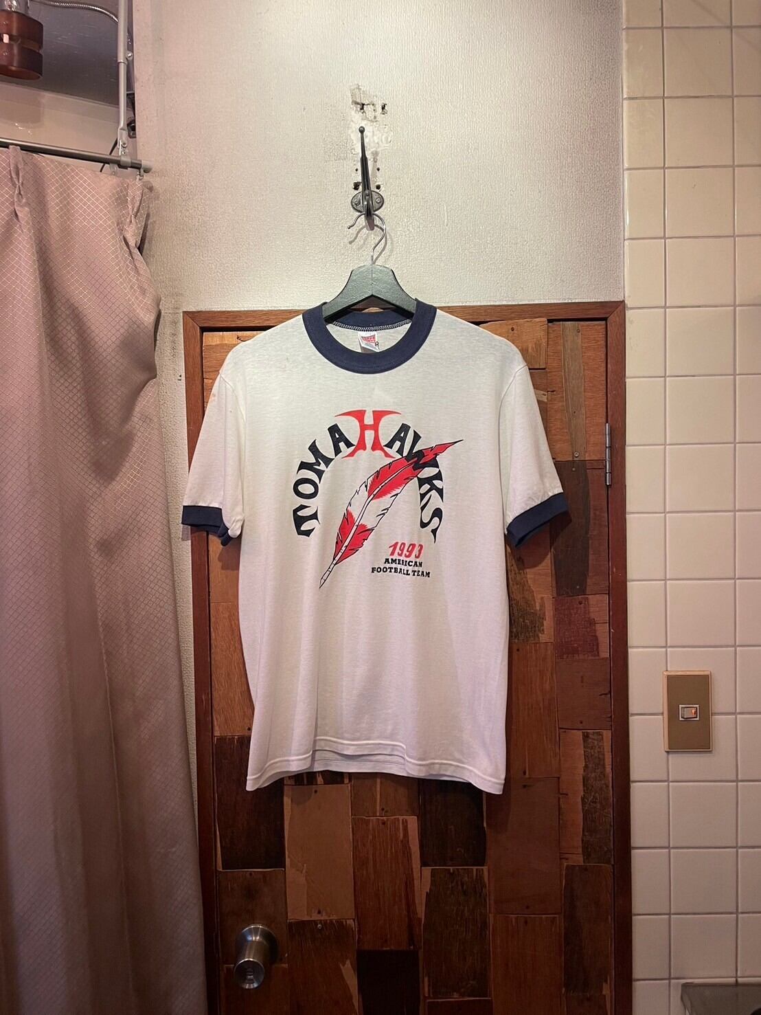 “SOFFE SHIRTS” 90's navy×white×red cotton/poly printed S/S linger Tee made in USA