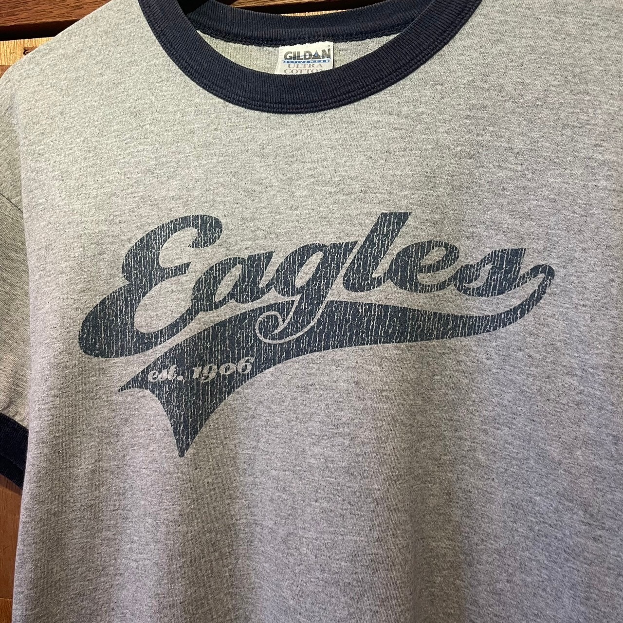 “GILDAN” 00's gray×navy cotton/poly printed S/S linger Tee