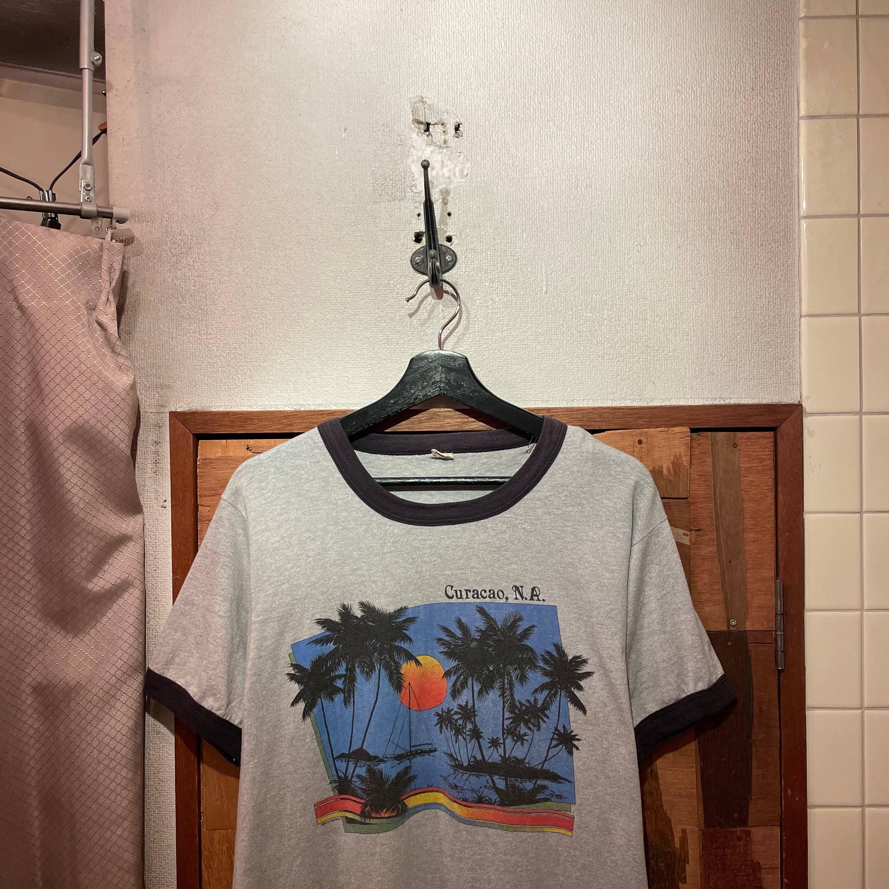 “SCREEN STARS” 80’s gray×navy cotton/poly printed S/S ringer Tee made in U.S.A
