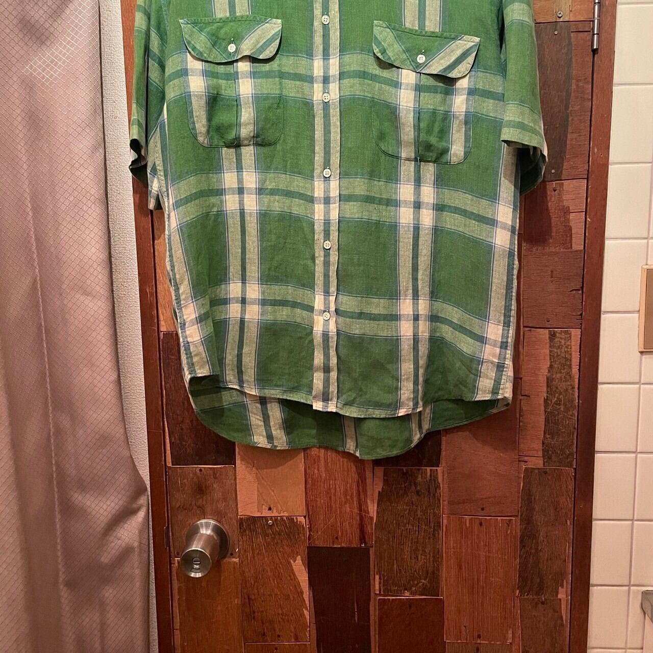 “Les Copains” green×blue×beige linen check pattern S/S shirt made in Italy