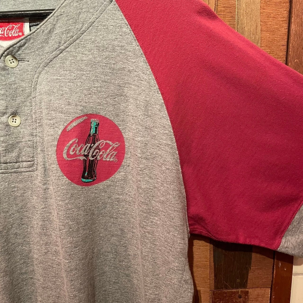 “Coca Cola” 90’s gray×red cotton switch henry-neck design S/S shirt