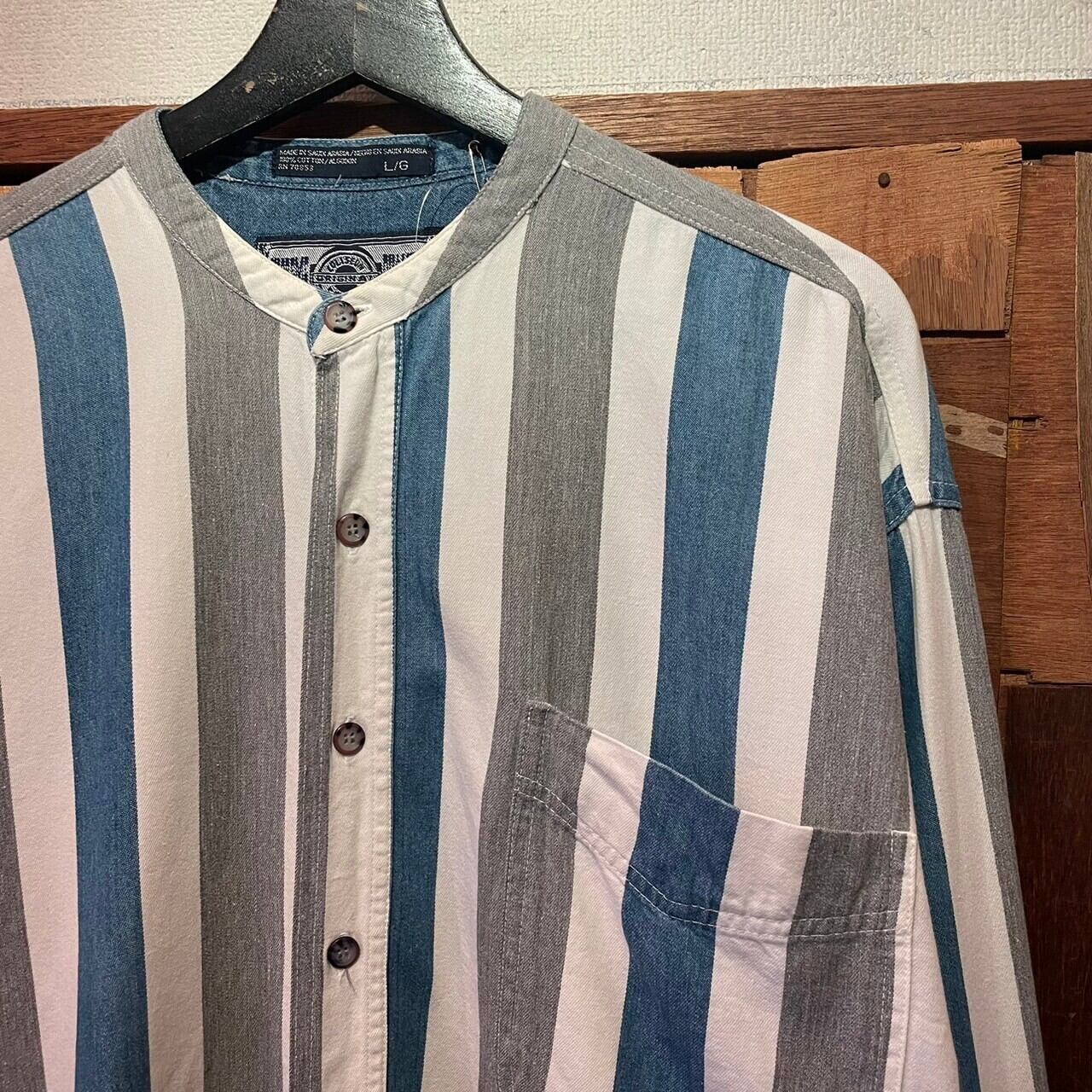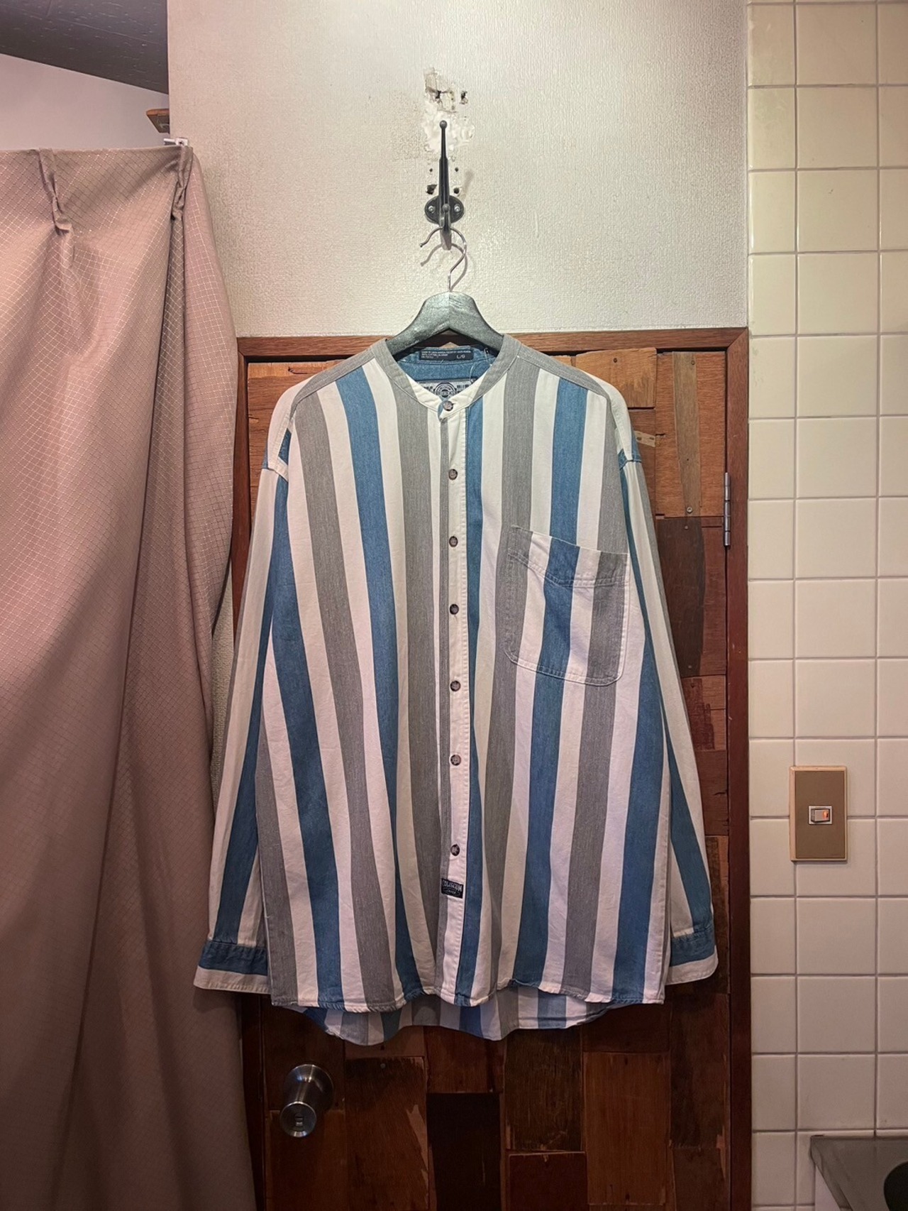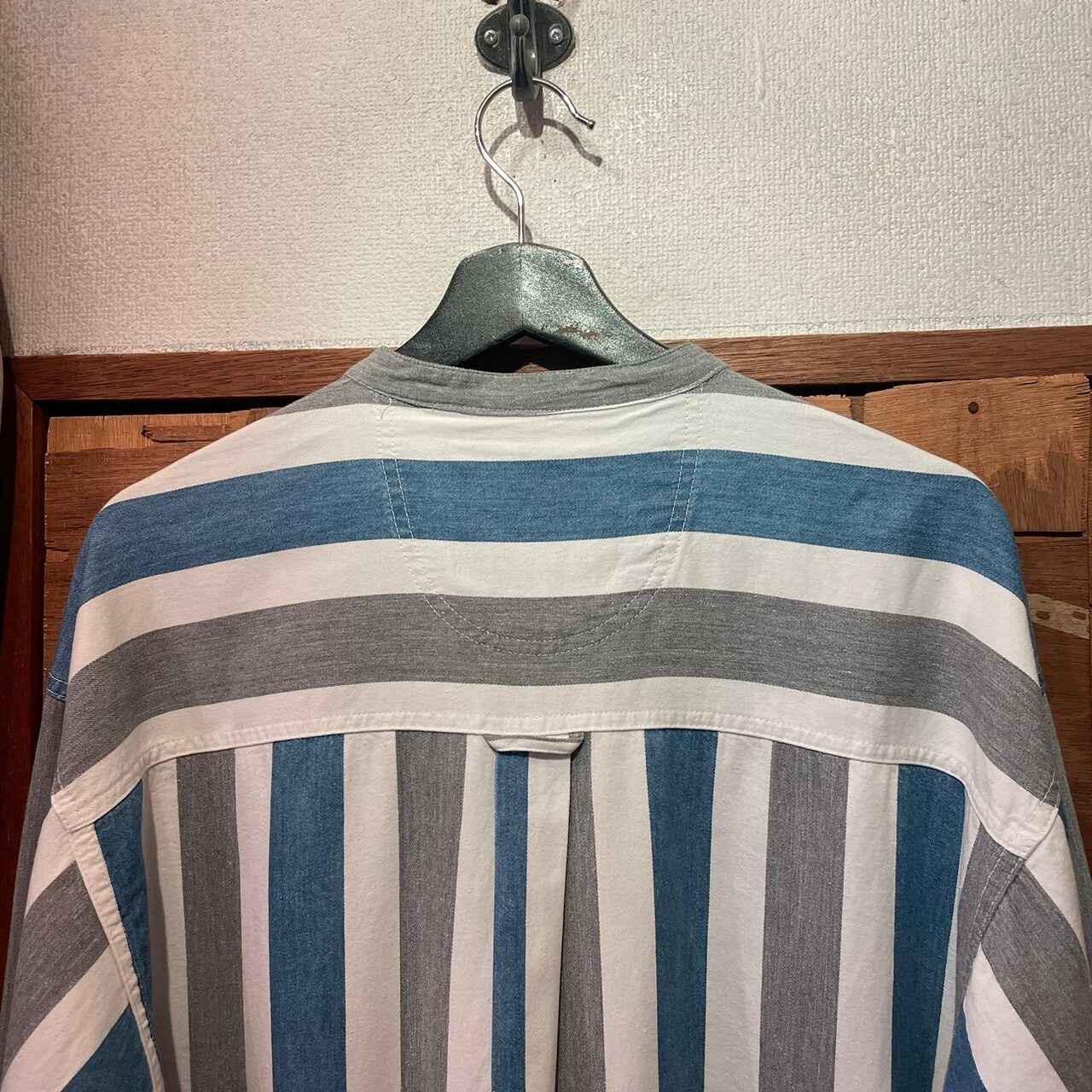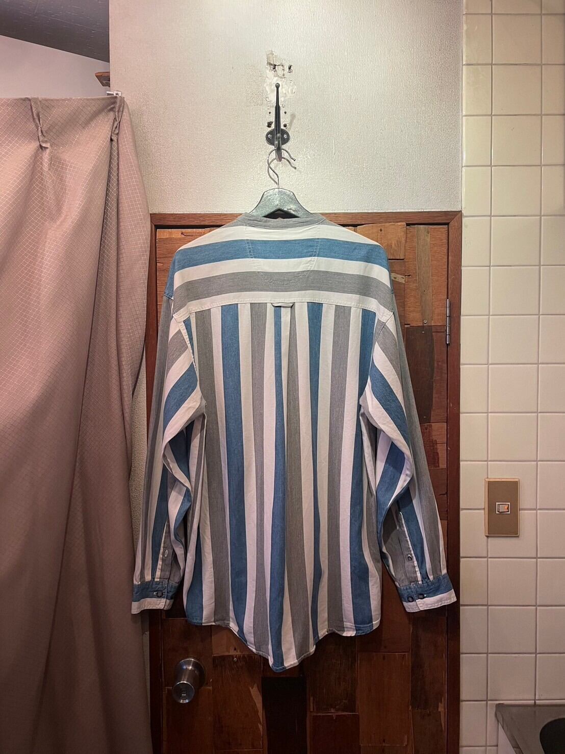 “COLISEUM” 80's blue×white×gray cotton stripe design band collar shirt